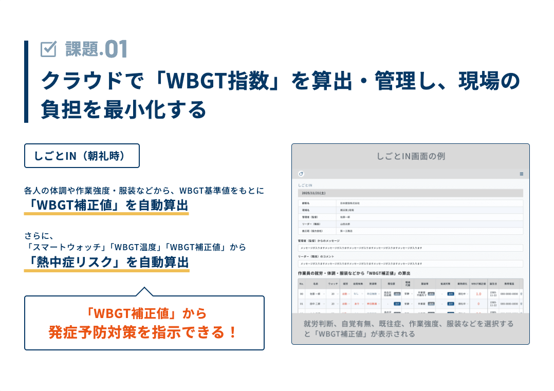 ・出勤時の体調・作業強度・服装などを考慮した各人の「WBGT補正値」の自動算出