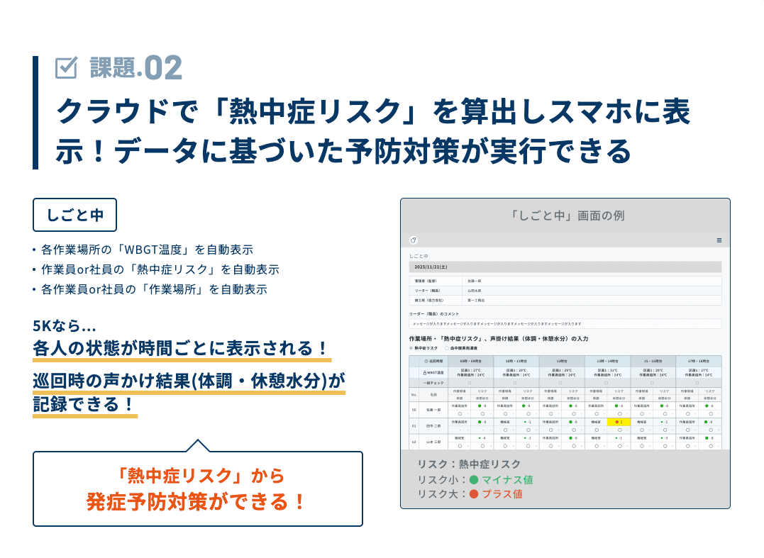 ・作業場所の「WBGT温度」から、各人の「熱中症リスク」を自動算出