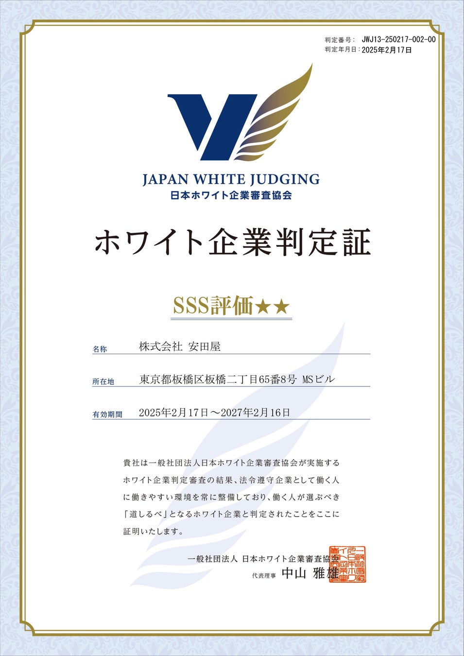 株式会社安田屋(本社東京都板橋区、代表取締役:山下信浩)は、2025年2月17日に一般社団法人 日本ホワイト企業審査協会様より、最上級の評価であるホワイト企業判定「SSS」評価をいただきました。安田屋がホワイト企業判定「SSS」評価をいただくのは、2023年に引き続き今回で2回目となります。