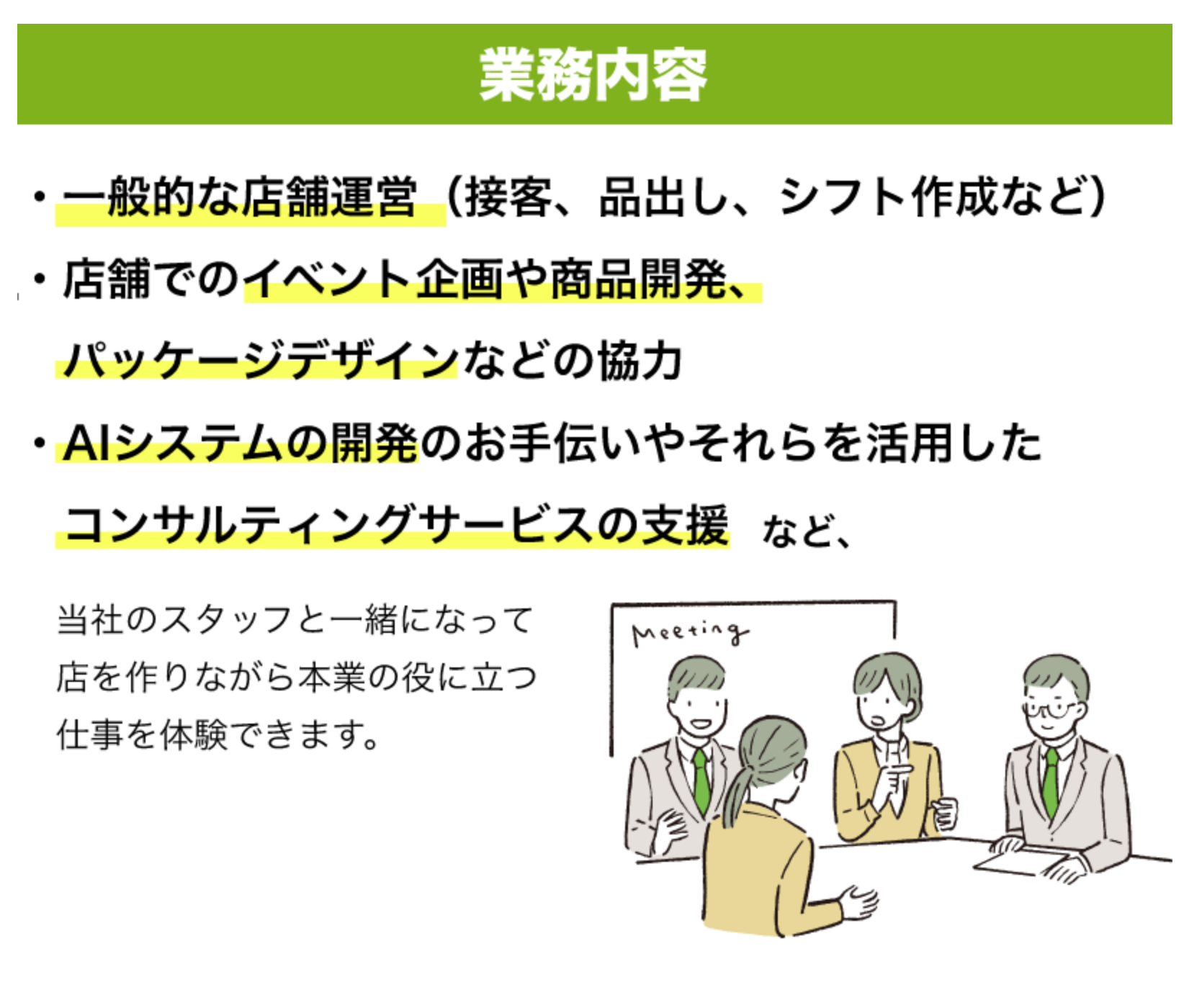 具体的には、学生のうちから当社の店舗でインターン生として働くことで、商品開発や魅力を伝えるためのイベント企画、AIカメラを活用したマーケティング支援のコンサルティングなどを体験できます。学生のうちから大手企業でも即戦力として働ける優秀な人材の育成や起業家精神に富んだ希少な人材の育成を行うことで、学生のキャリア形成を早いうちから行えるようにすることで、当社のクライアントへの提案力を高めるだけでなく、学生の就職活動などで有利な経験をしてもらうことで、希望の企業に入社できるような仕組みを作ることで、中小企業の活性化や優秀な学生の輩出につなげる予定です。