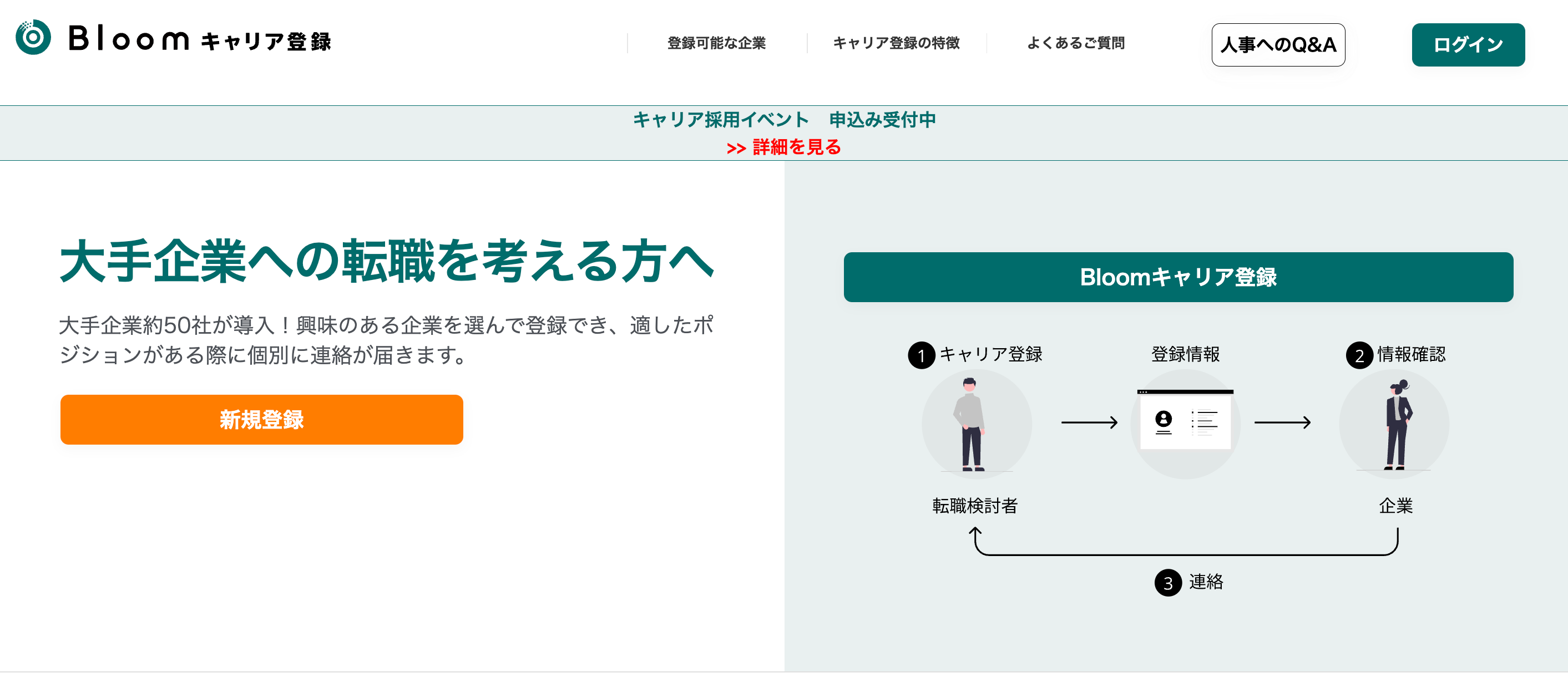 株式会社Bloom(本社:東京都渋谷区、代表取締役:平原俊幸)は、転職を考える個人が大手企業から直接情報提供や個別連絡を受けられるキャリア登録システム「Bloomキャリア登録」を開発・運営しています。2018年9月のサービスリリース以降、大手企業特化型のプロダクトとしてKDDI・トヨタ自動車・三井物産・LINEヤフー・花王など各業界のリーディング企業が続々と導入。各企業の採用ホームページ上の「キャリア登録」ボタンからサービス登録ができ、累計で400名以上が大手企業からの直接連絡をもとに転職を実現しています。「世界を変える大手企業が共に創る、採用の増加と進化」をサービスコンセプトとし、大手企業複数社による協働開催型オンライン転職イベントも頻繁に開催しています。