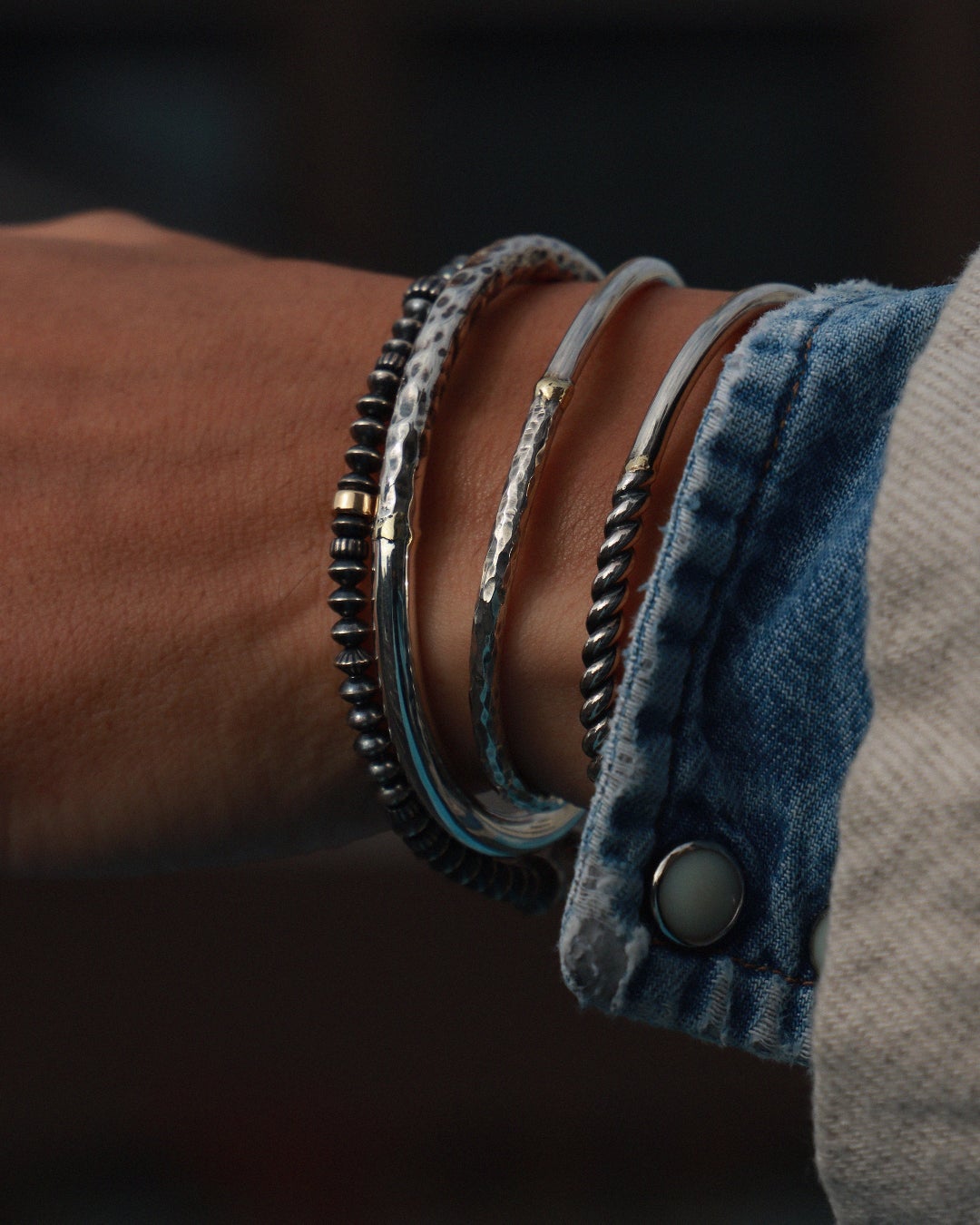 特に大ぶりのバングル・ブレスレットはその圧倒的な存在感とデザインで、数多あるブランドの中でもひときわ目を引く存在。モチーフを揃えながらのレイヤードやシャツ上に重ねるなど、FANTASTIC MANならではのデザインは装いに奥行きを与え、街中でも一目でわかる個性を演出します。