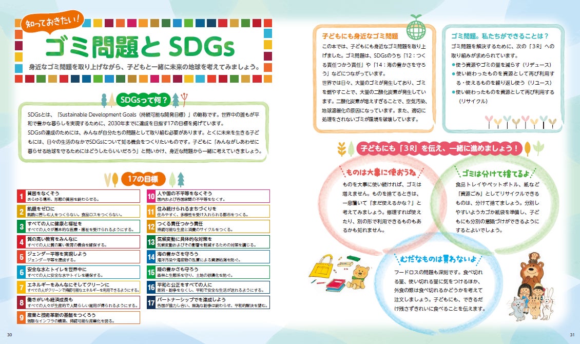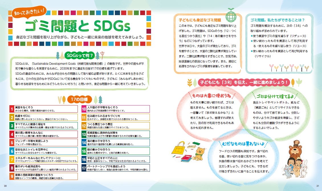 保護者・保育者のみなさま向けに、「子育て・保育×SDGs」についての解説ページを付けています。“ご家庭や園でできるSDGs”について理解を深めていただけます。