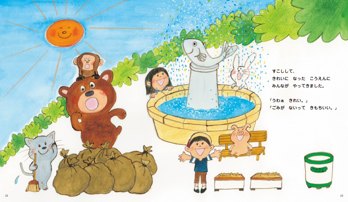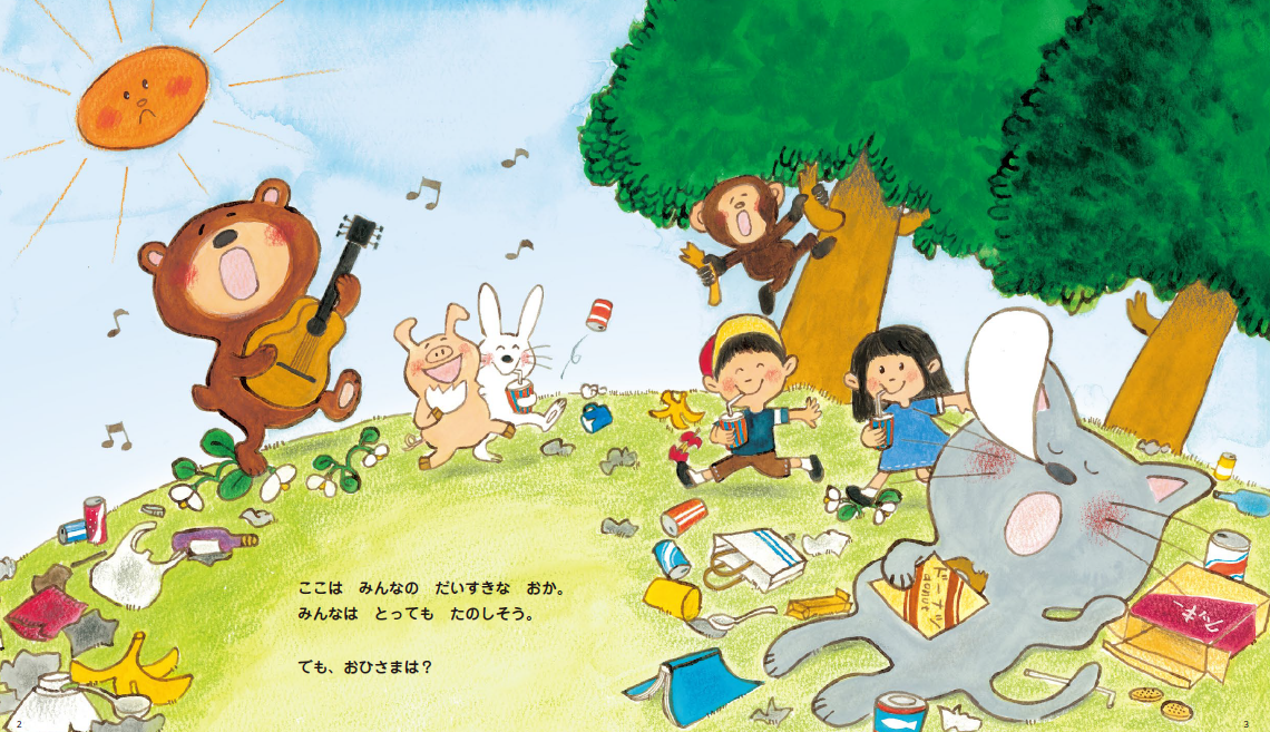 おひさまのねがいは、ゴミのない、きれいな地球。山や海や公園でみんなが楽しく遊べることでした…。