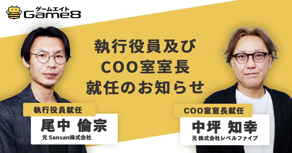 株式会社ゲームエイト(本社:東京都渋谷区、代表取締役:西尾 健太郎 以下、ゲームエイト)は、本格化するソリューション事業のグローバル展開に向け、執行役員に尾中 倫宗 (おなか まさむね)、COO室 室長に中坪 知幸 (なかつぼ ともゆき)が新たに就任したことをお知らせいたします。