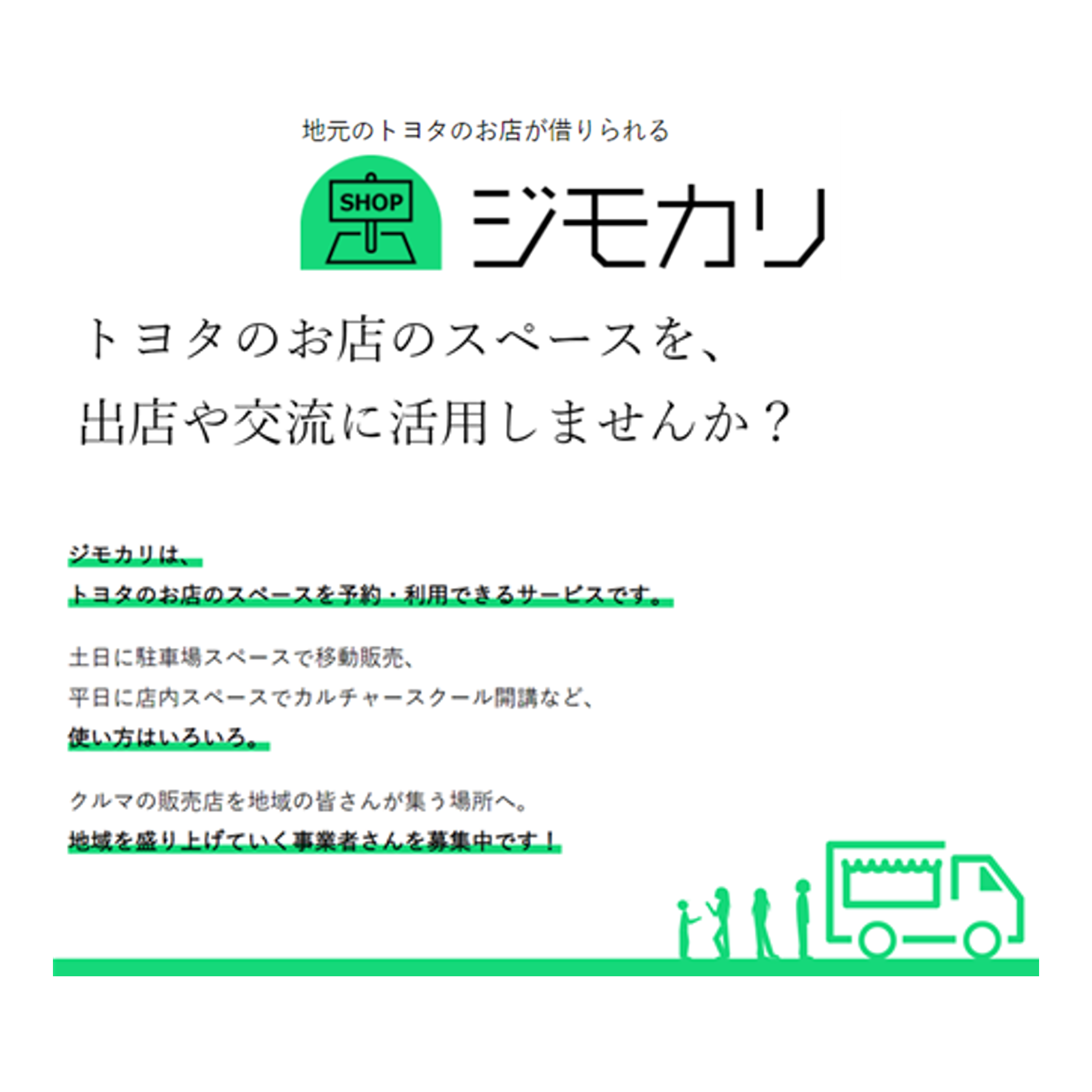 『ジモカリ』(仮称)では、キッチンカーなどの移動販売や物販、趣味のワークショップや教室などの開催場所をお探しの方々に、トヨタ販売店のスペースをご利用いただく機会を提供いたします。