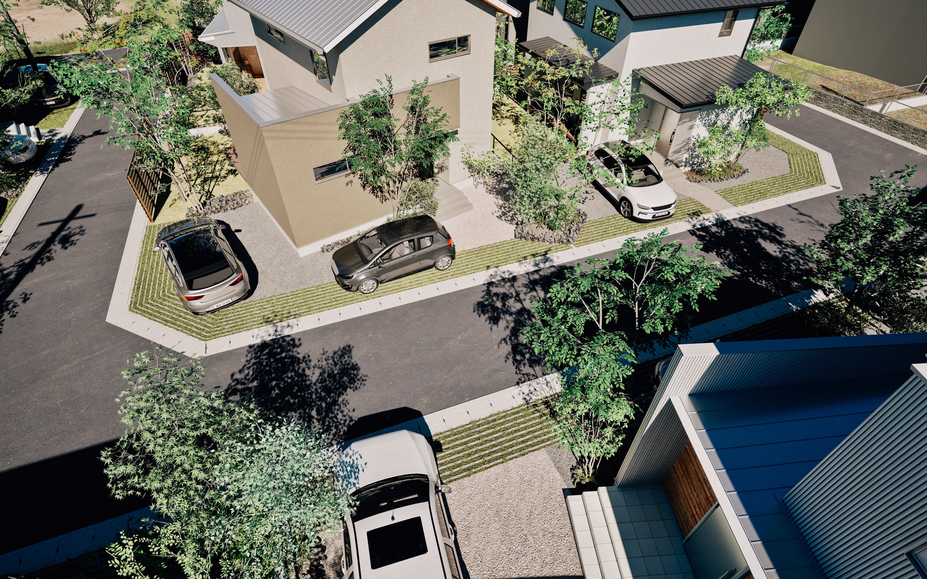 施工の合理化とクリエイティブな提案を生み出すために、プロの知見で「仕様の標準化」や「厳格な設計ルール」を定めます。また、居住空間を庭へ拡張し、多様なシーンを創出。「家の外への意識」が自然な交流と「顔の見える関係」を生み、地域の防犯・互助機能を高めます。