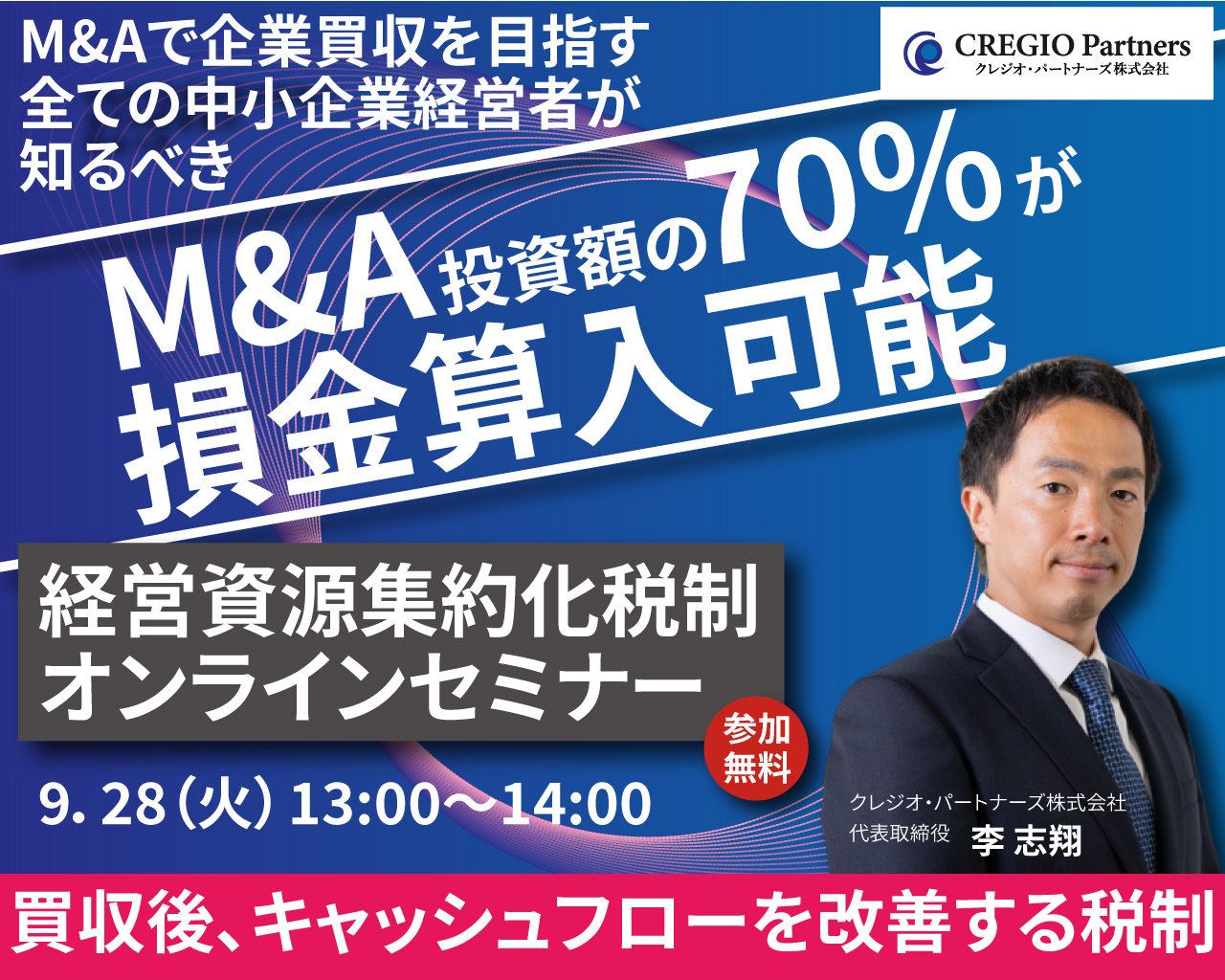 本セミナーは、M&Aで企業買収を検討する経営者に、経営資源集約化税制(主に中小企業事業再編投資損失準備金)の概要と活用のポイントについて理解を深めて頂くためのイベントです。中小企業のM&A、資金調達、税制について知見を有するクレジオ・パートナーズ株式会社 代表取締役 李 志翔が「経営資源集約化税制」について解説します。