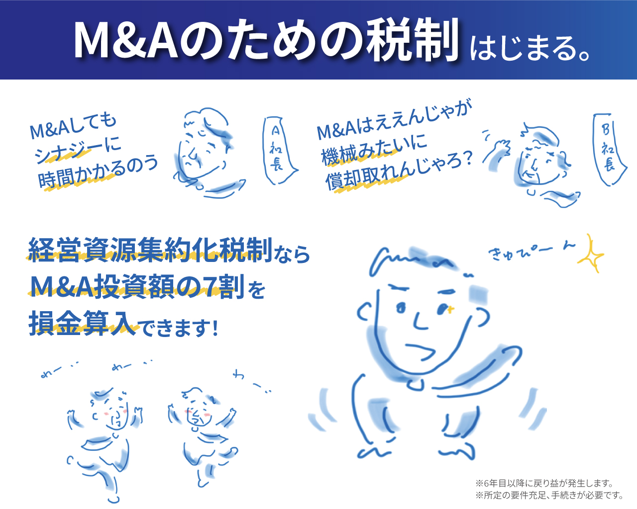 「経営資源集約化税制」は、M&Aにより生産性向上等を目指す、経営力向上計画の認定を受けた中小企業が、M&A実施後に発生する簿外債務等のリスクに備えるため、投資額の70%以下を準備金として積み立て、損金算入できる税制です。