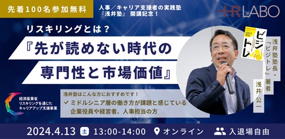 リスキリング講座開講に先立ち、4月13日HRラボリスキリング講座にてキャリアマネジメント講座(浅井塾)の講師を務める浅井公一氏による特別イベントを開催します。