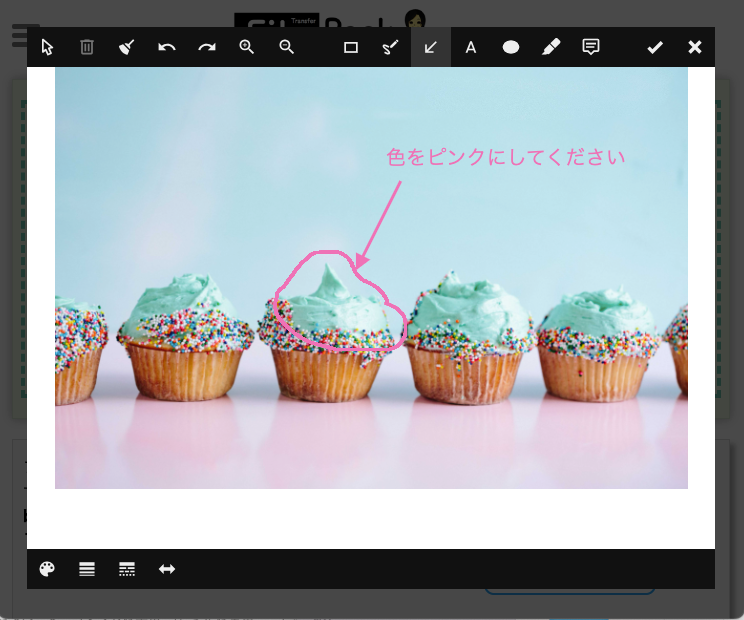 ファイルパックの画面上から、アップロードした画像に描画ツールで注釈(=書き込み)を行い、そのまま送り先に共有することができます。これによって、担当者間でのフィードバックのやり取りがスムーズに行えるようになります。