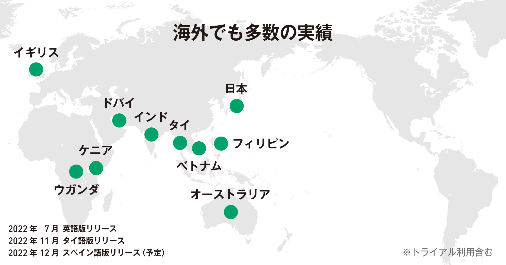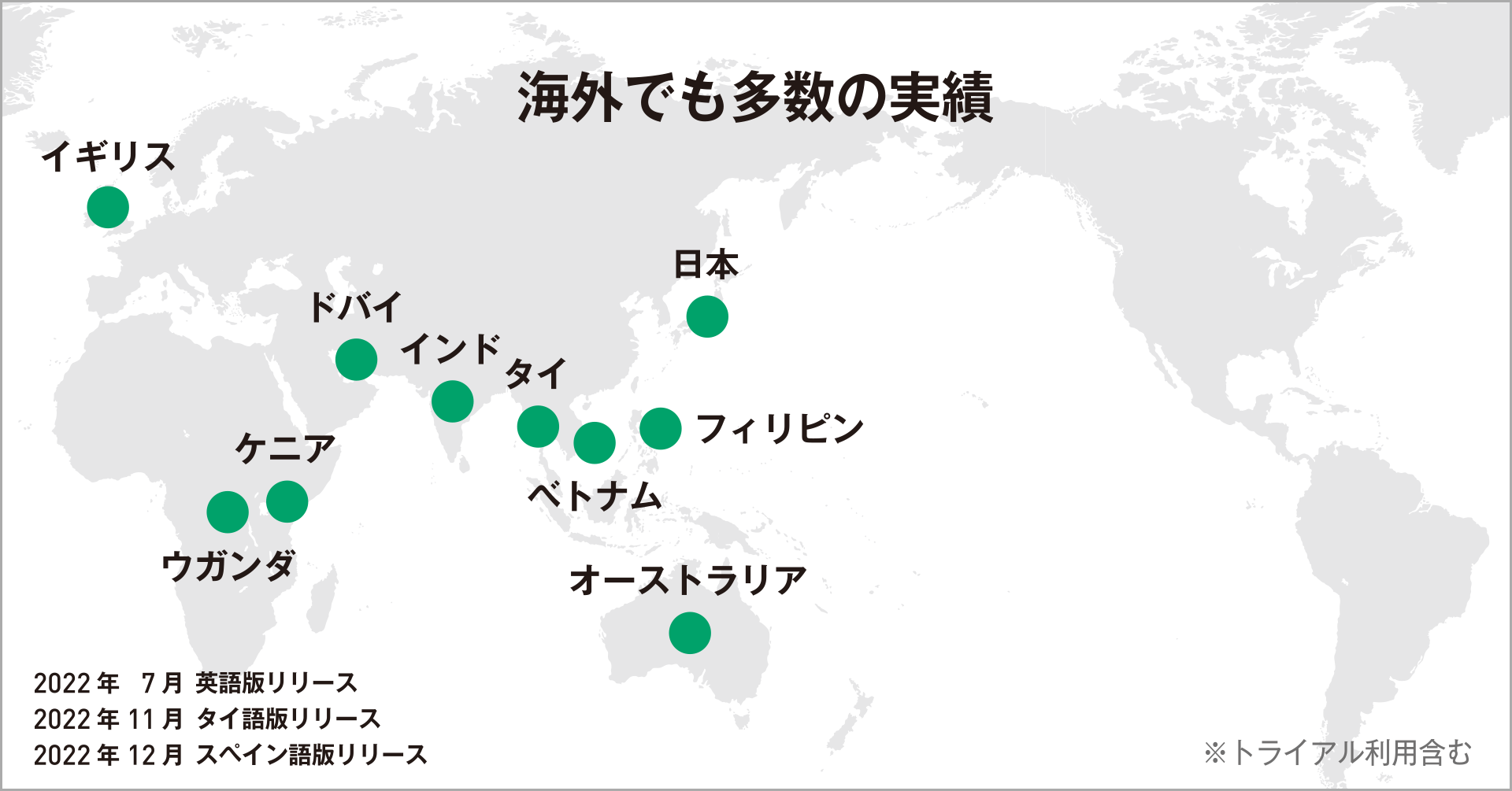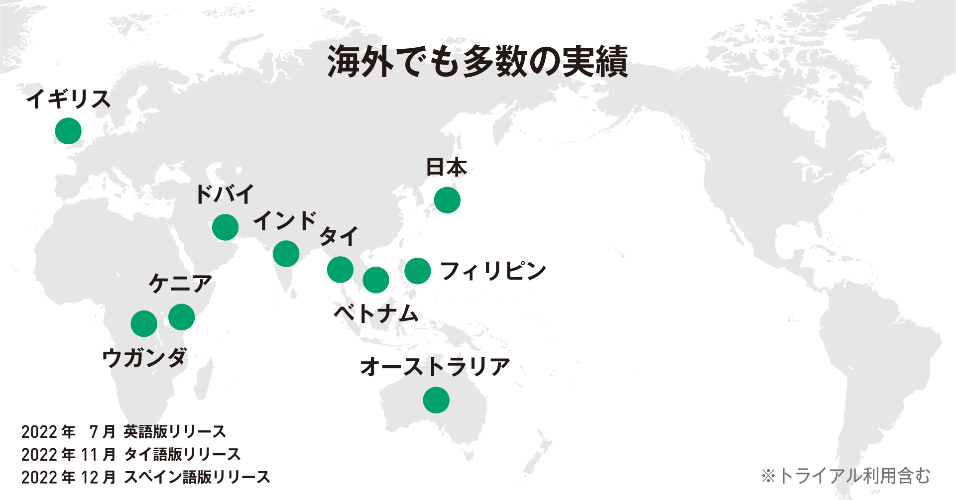 また、2022年7月に「KANNA」の英語版リリースを皮切りに海外展開も加速しており、既に複数の国で導入が決定し、トライアル利用を含めると10カ国以上の国でKANNAをご利用いただいております。
