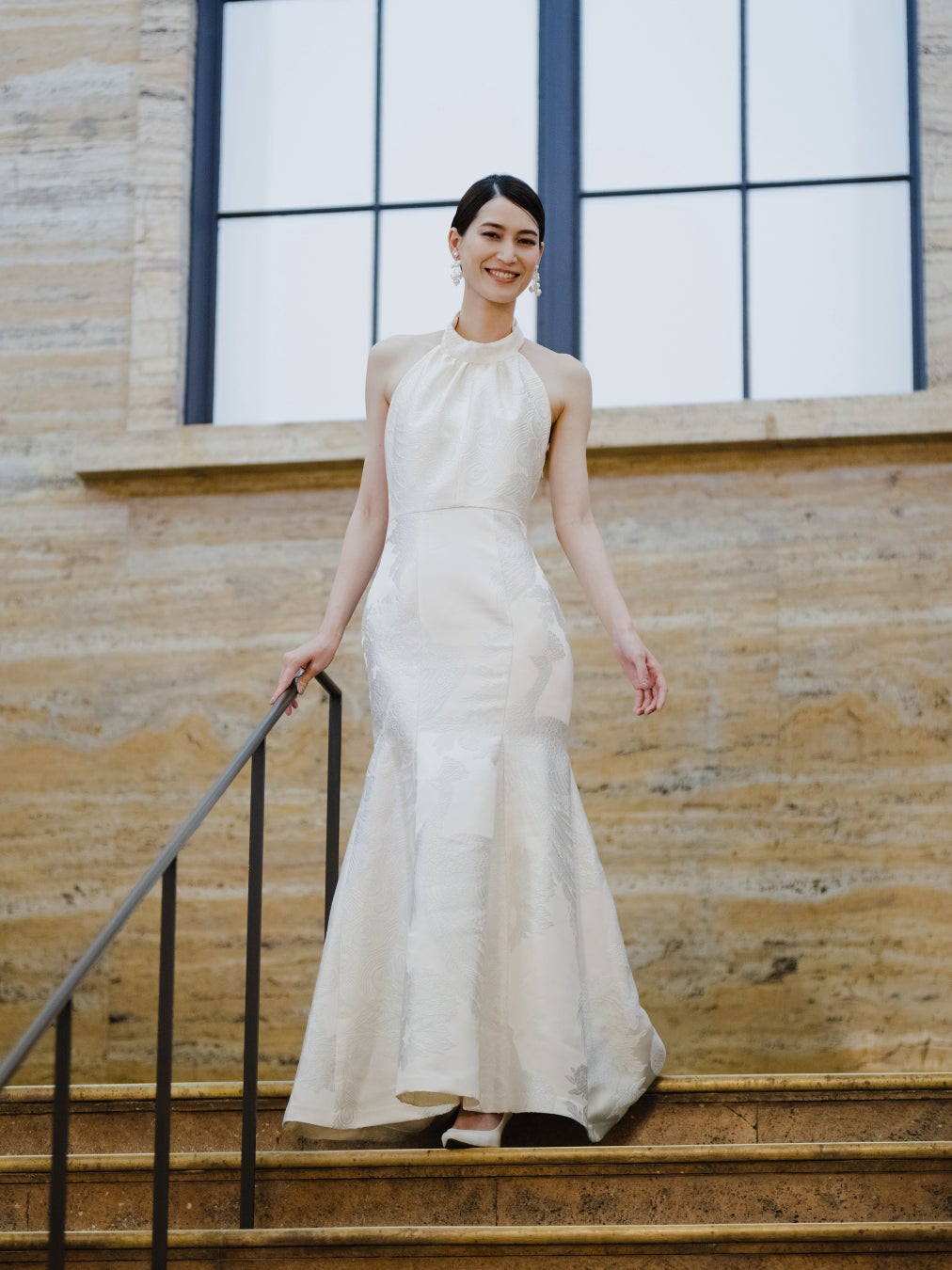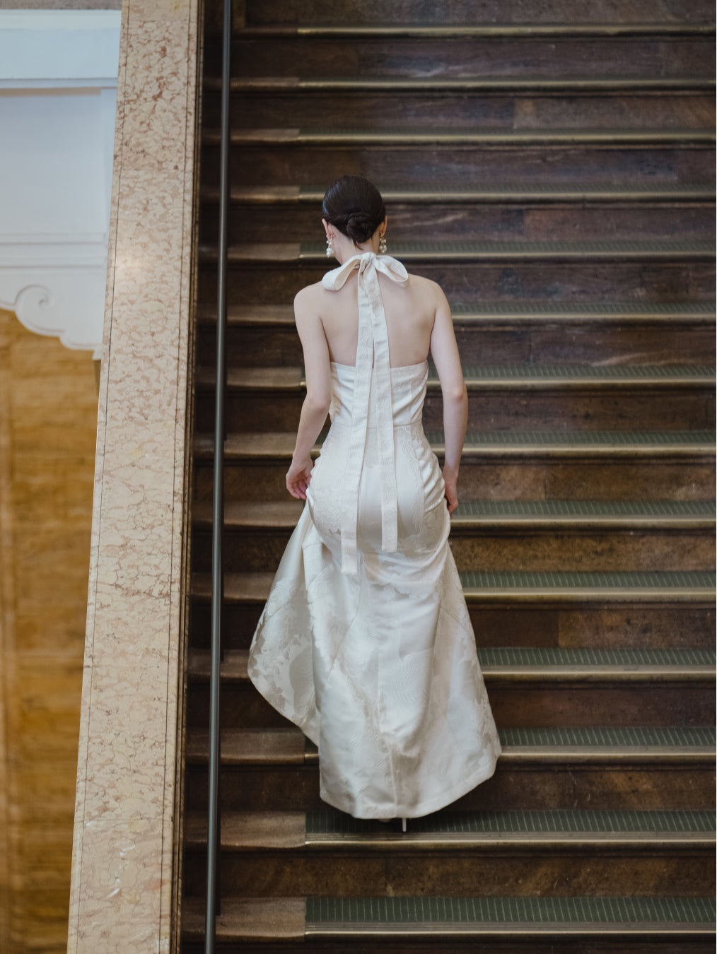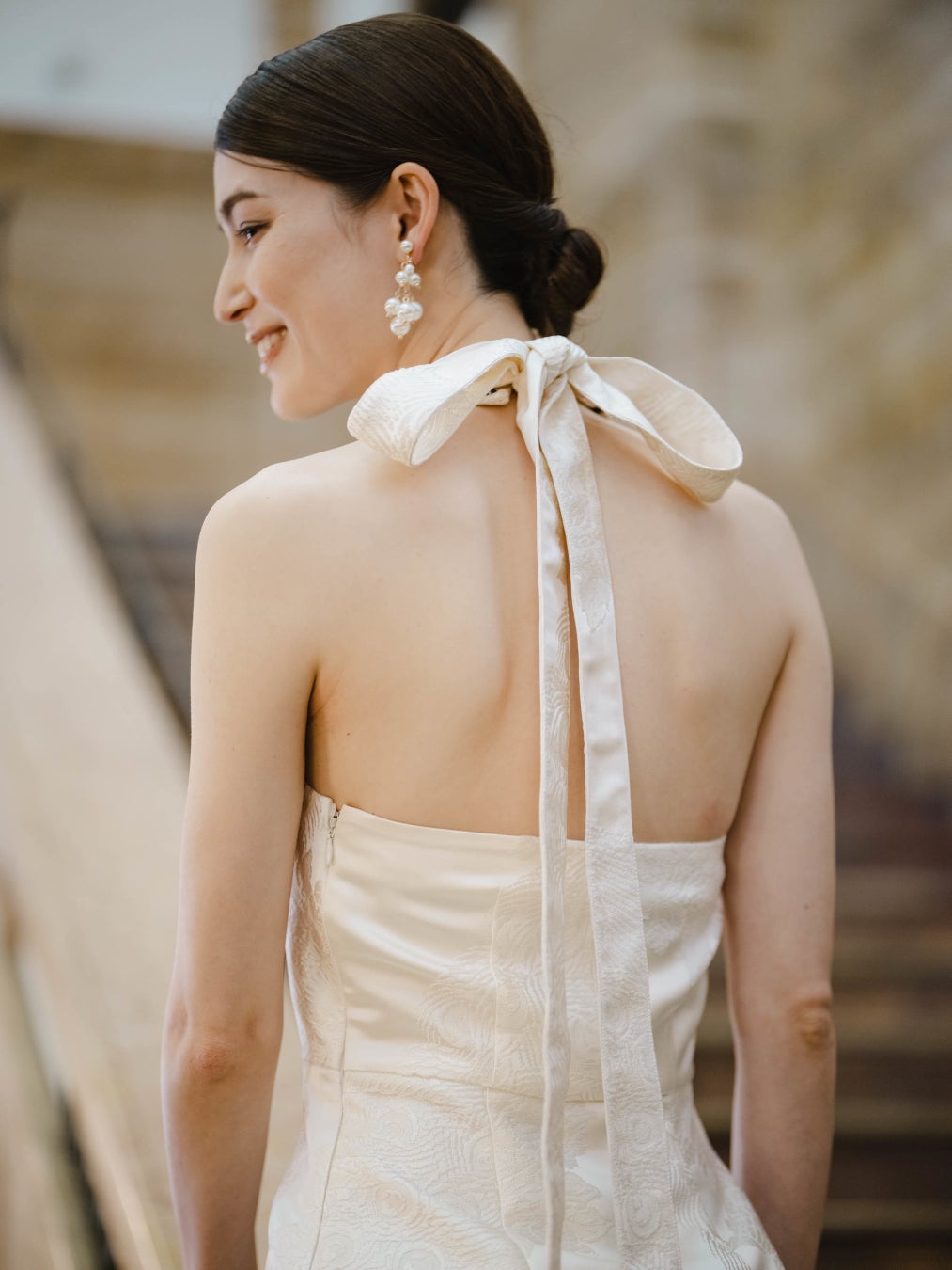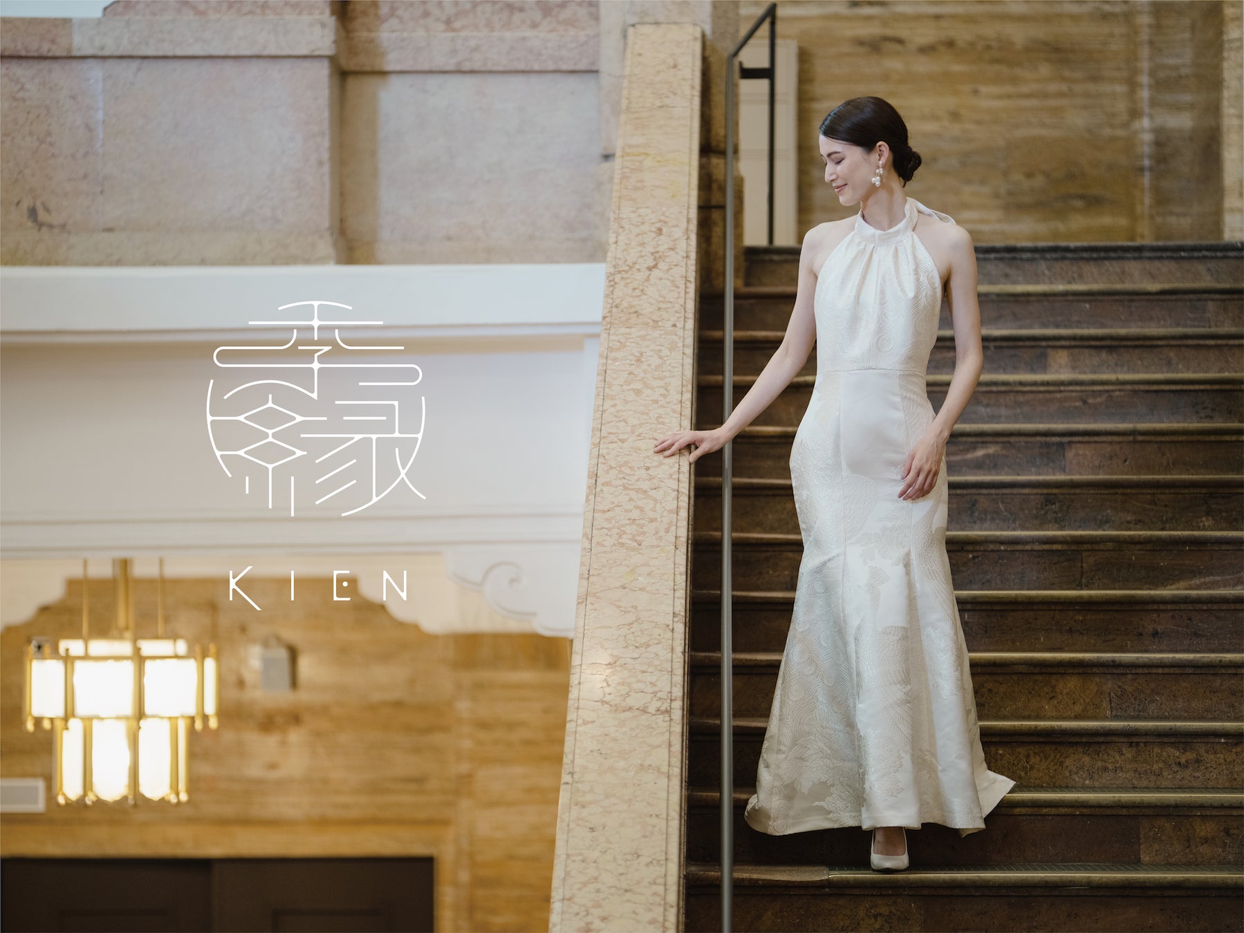 「季縁-KIEN-」 を代表するきものドレス「Halter neck」をベースに、白無垢の繊細な文様を生かしたラグジュアリーなウエディングドレス。背中のリボンがシンプルなデザインのアクセントになっています。