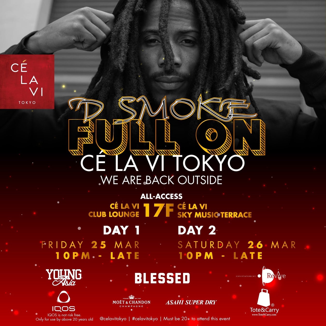このリオープニングパーティーに華を添えるのはNetflixの「リズム&フロー」で優勝し、第63回グラミー賞で2部門にノミネートされた「D SMOKE」。2019年のカウントダウン以来、2年ぶりにCE LA VI TOKYOのステージに登場し、会場を盛り上げます。