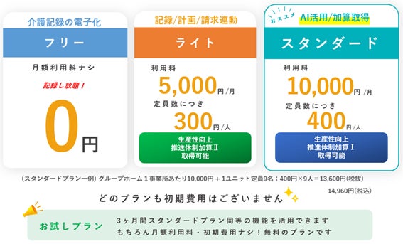 この度ローンチする「健康予測AI」「個別介護計画書AI」は、スタンダードプランから利用可能。