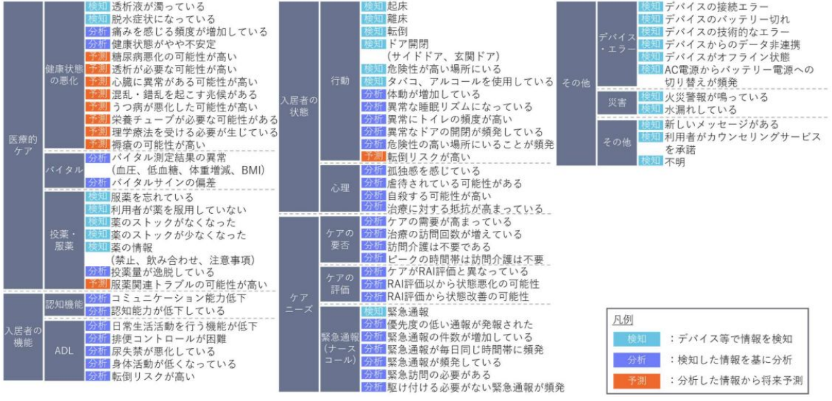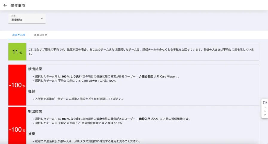 介護記録やアセスメントデータ、主治医の意見書などの様々な利用者に関わるデータを独自のAIモデルにより分析し、最大5年先までの予測を含む、利用者の健康状態や転倒・入院リスクなどをアラートを出すことで事前予測する。加えて、リスクを防ぐ為にどのようなケアをすべきかも指南される。