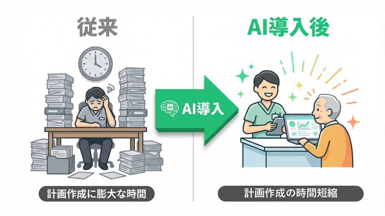 これにより、個別介護計画書等の書類作成にかかる時間が90%程度大幅に削減され、利用者に対して、適切なケアの提供が可能となる。