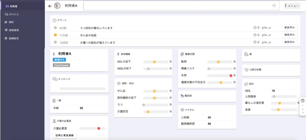 健康予測AIでは、各利用者ごとに24時間365日モニタリングが更新され、各利用者の健康状態のリスクや、スタッフどのようなケアを行なえばよいかを常に把握することが出来る。