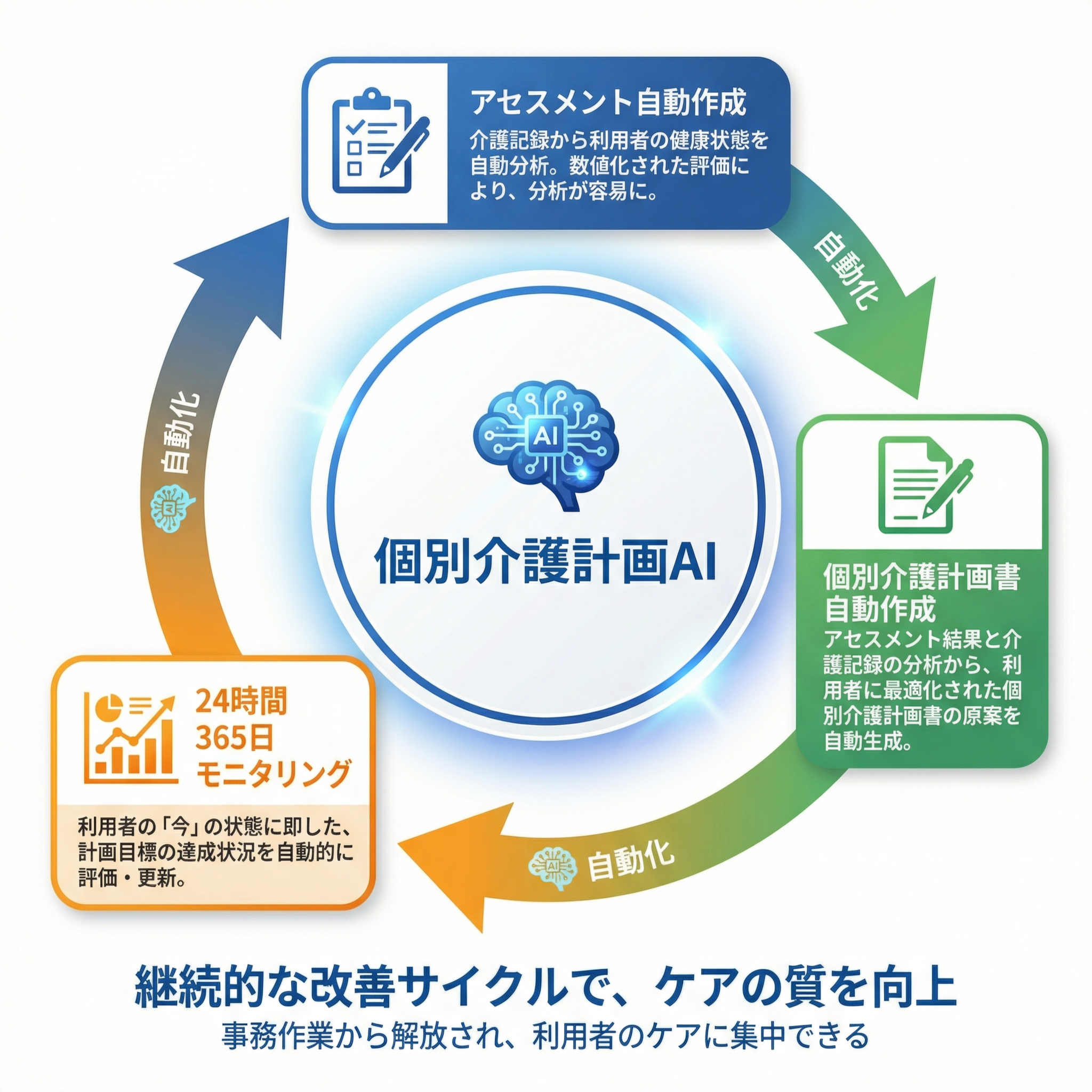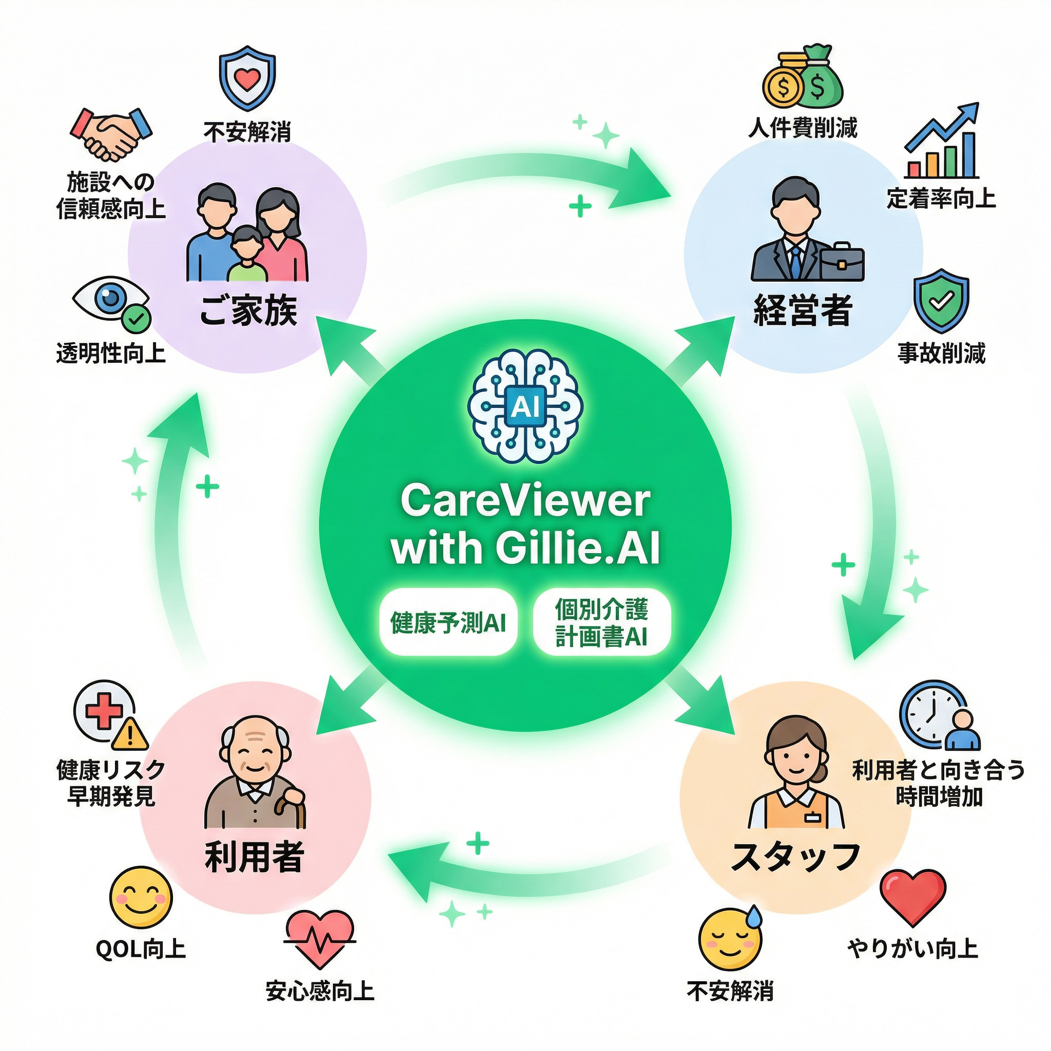 AIの導入は、単なる業務効率化に留まらない。経営者、スタッフ、利用者、そしてそのご家族のそれぞれにメリットをもたらし、介護事業所全体に好循環を生み出す。