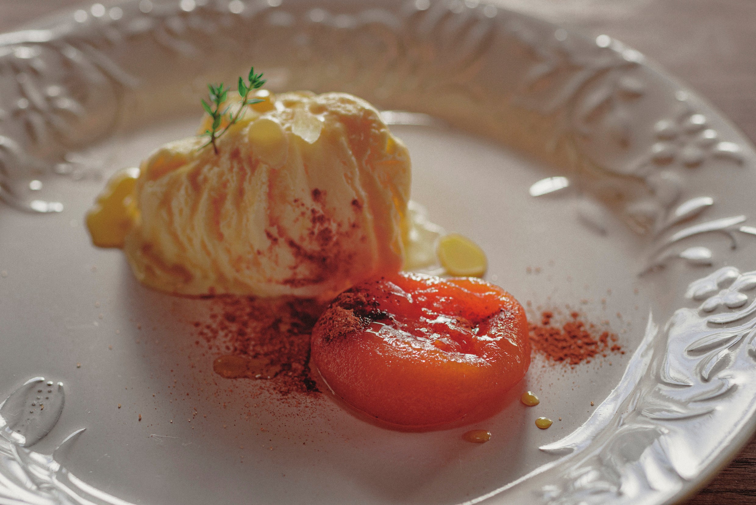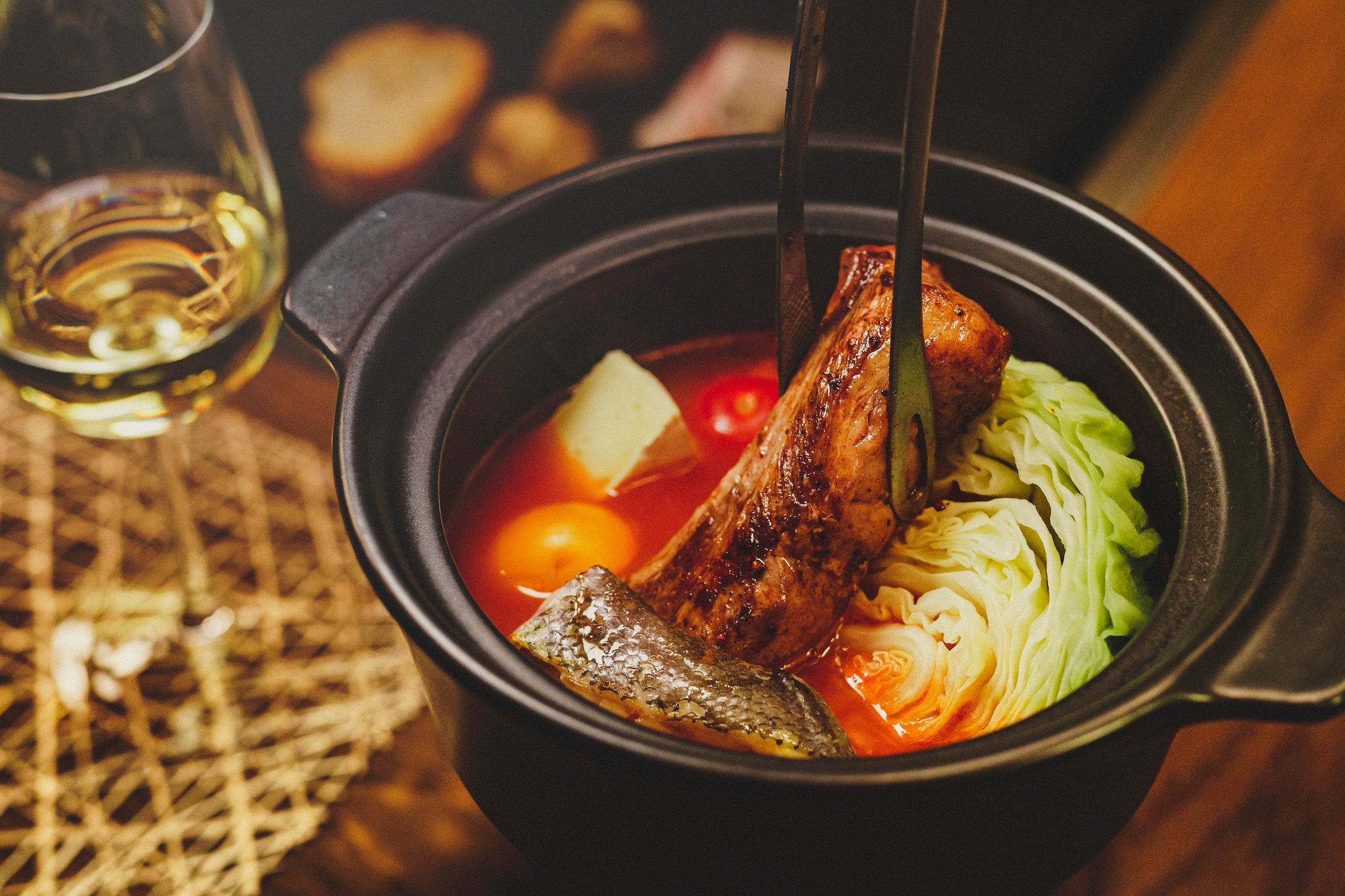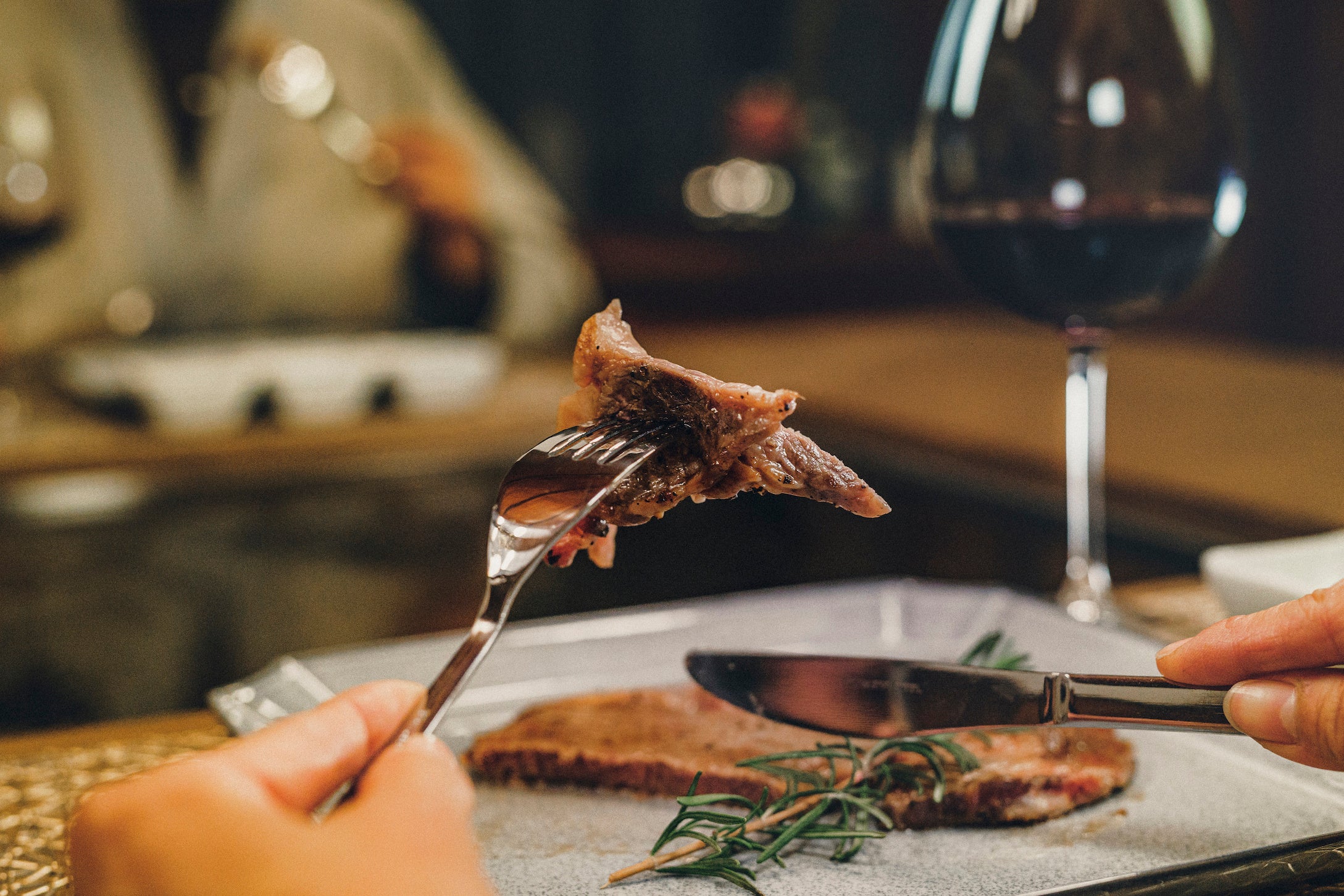 お食事は、前菜からデザートまで、目の前の鉄板で仕上げてお召し上がりいただくコース料理。フランベして焼き上げるステーキや、鉄板でワイン蒸しにした具材を楽しむトマトチーズ鍋、季節のフルーツのバター焼きを添えたデザートなど、甲斐信玄鶏、富士桜ポークや有機野菜といった県内産の新鮮な素材を、じっくりとご堪能いただけます。季節ごとに変わるメニューと、勝沼のワインを取り揃えたリストをお楽しみください。
