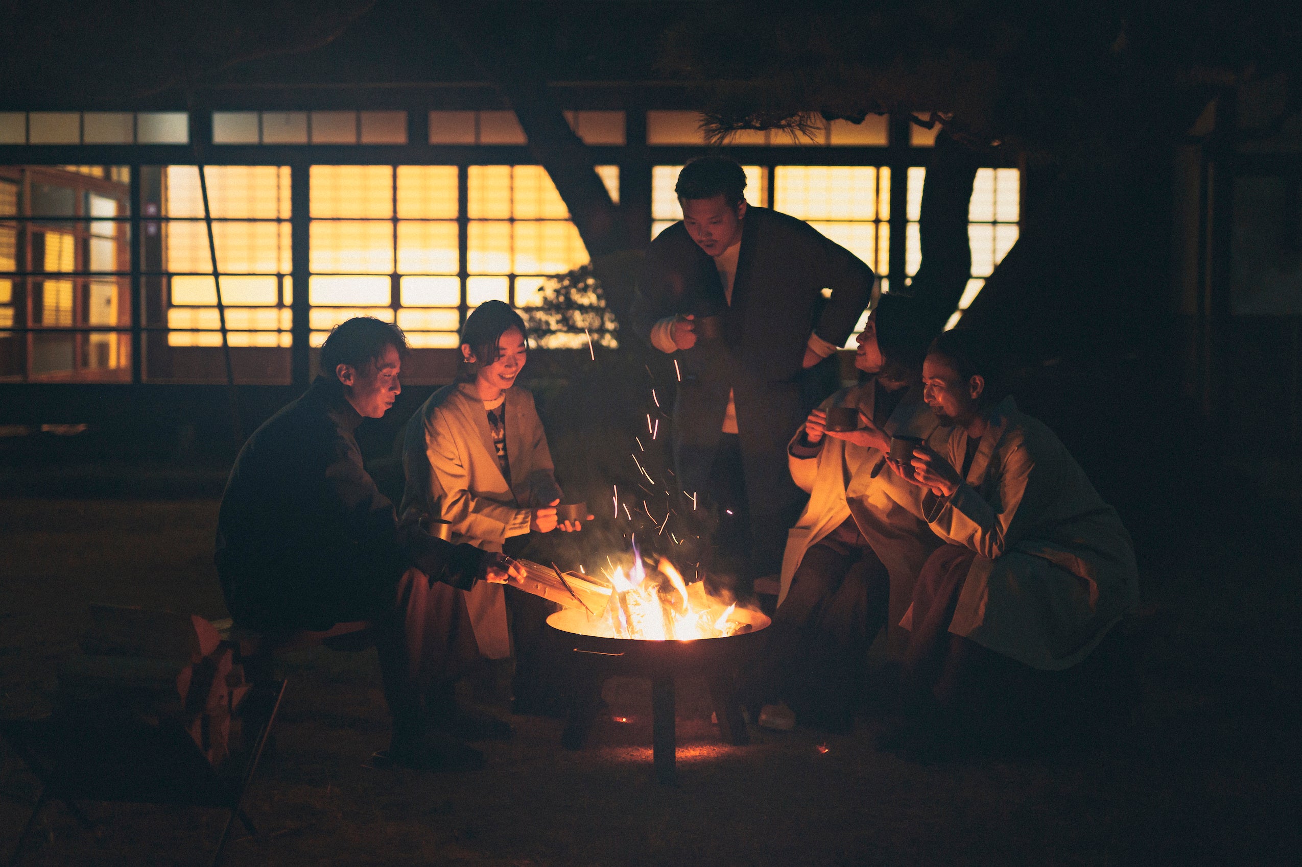 お庭に焚き火台をご用意しています。自然に囲まれた古民家宿での静かな夜、揺れる炎を前に都会では体感できないリラックスを。
