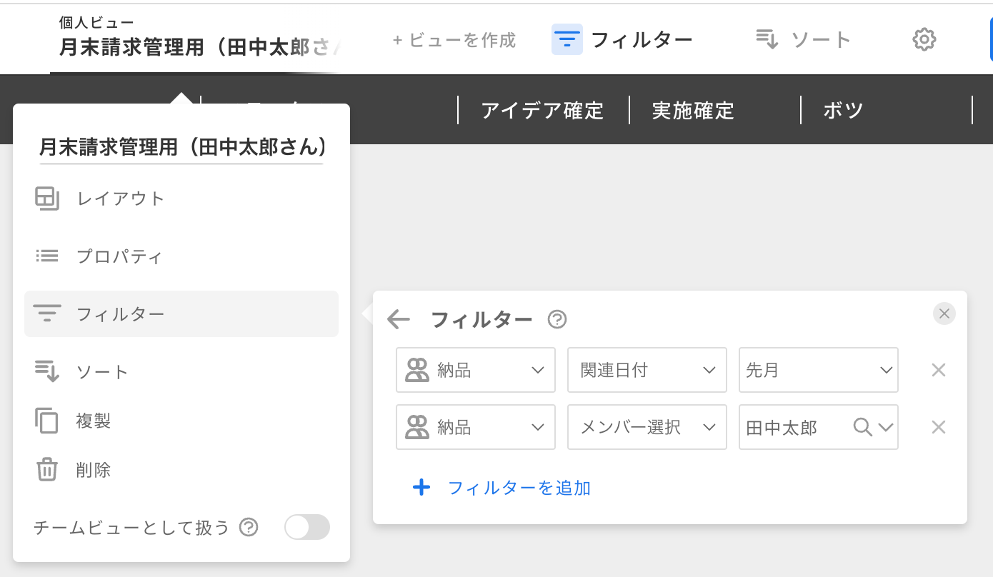 より発展的に使いこなしている事例としては、「納品日が先月」かつ「編集担当者がOOさん」といった条件のビューを作ることで、請求管理の手間を大幅に削減するといったことも可能です。