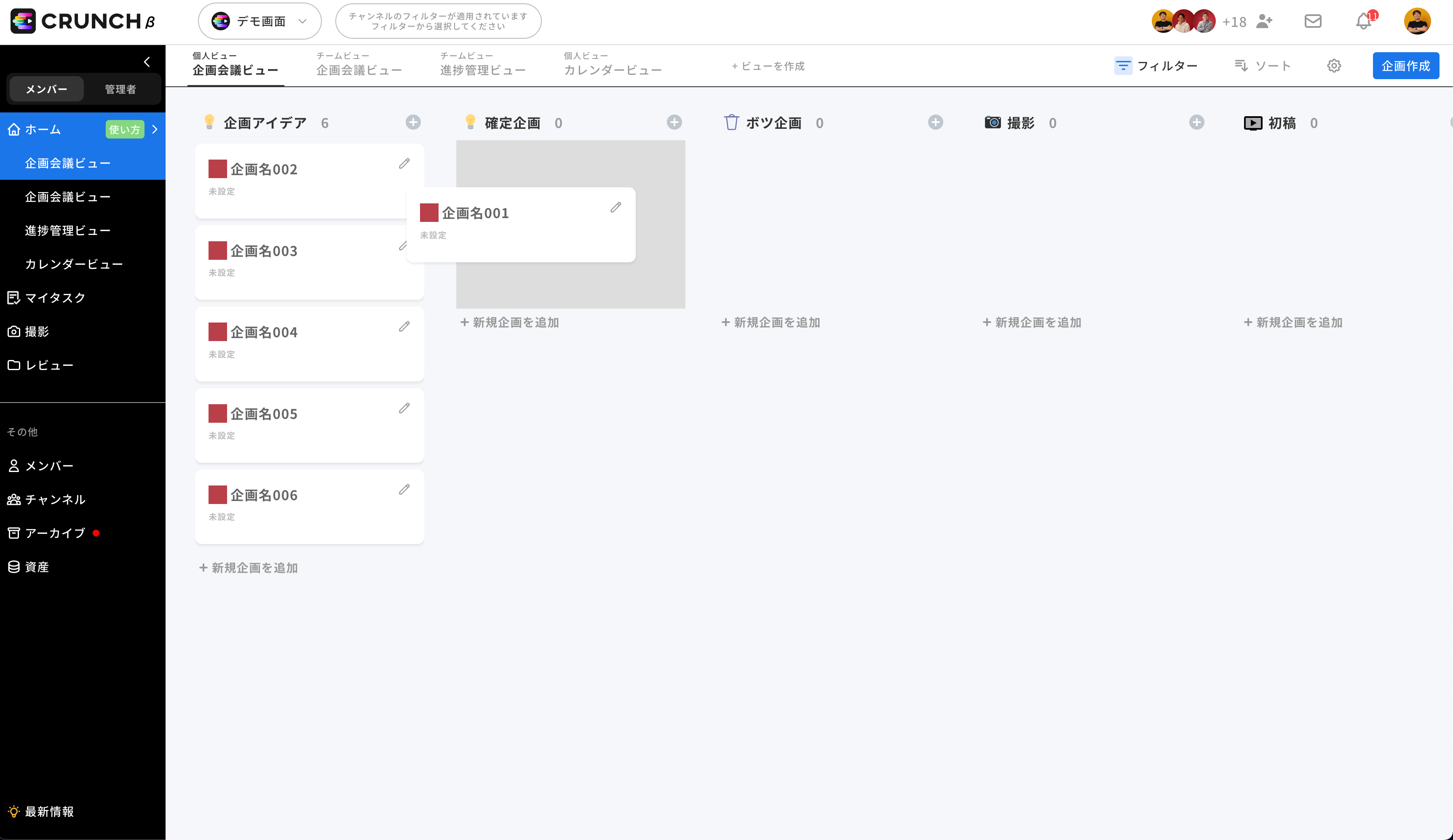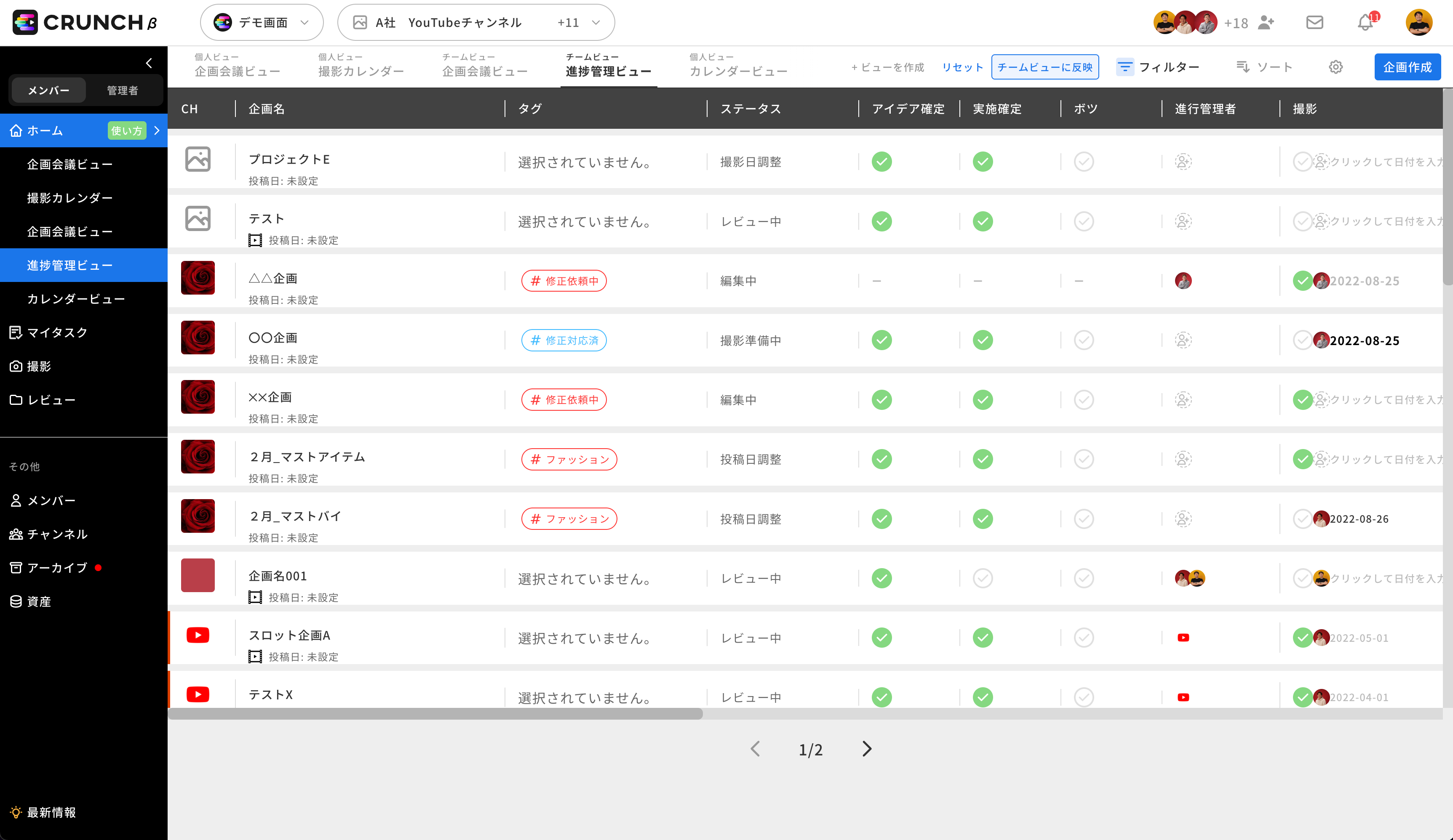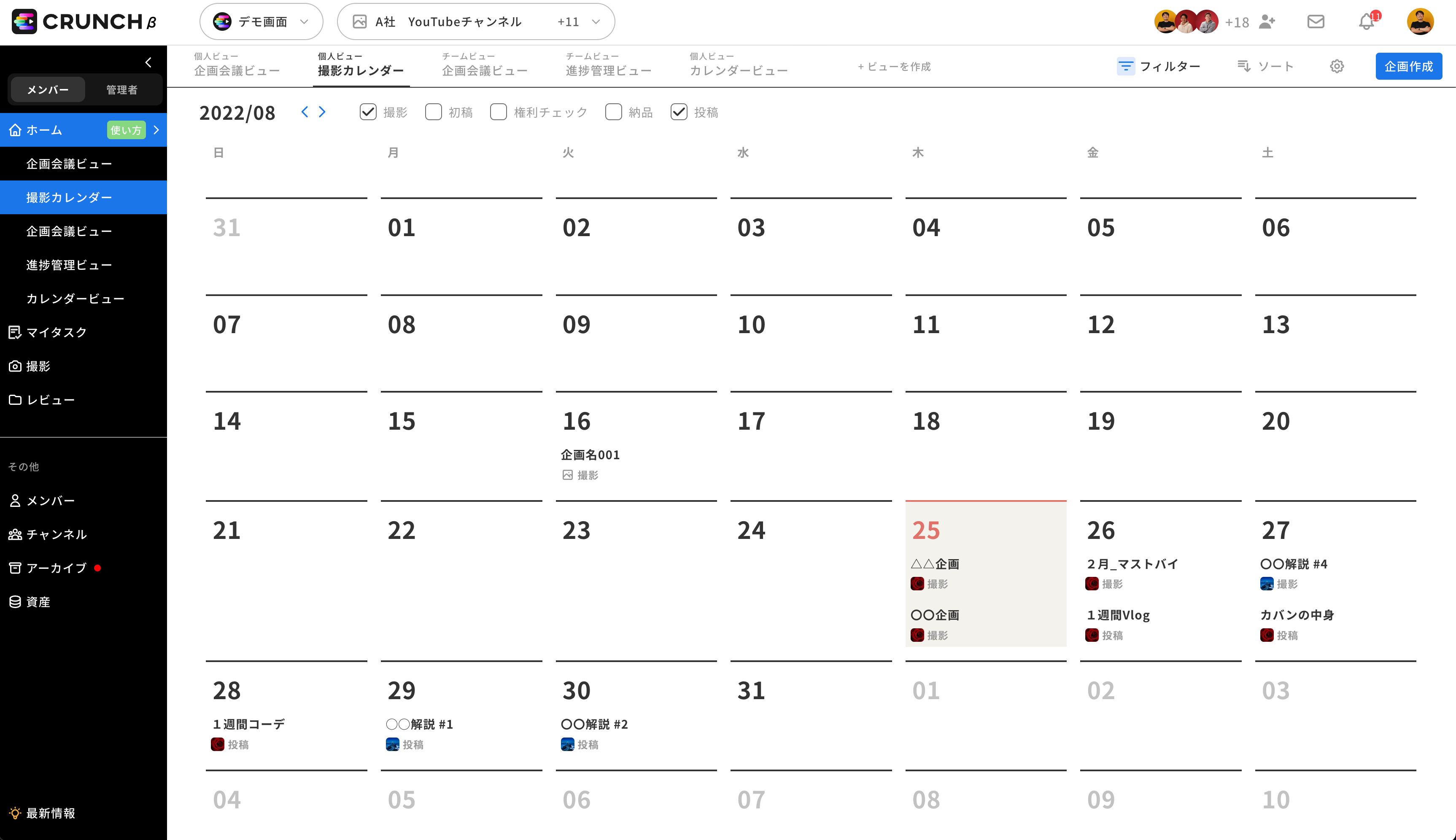 CRUNCHには企画情報として、撮影日や投稿日などのスケジュールや担当者、撮影素材、動画ファイル、サムネイルといった情報もまとめて一箇所に入力することができます。データは常に他のメンバーも閲覧することができるため、スマートに情報伝達することができます。