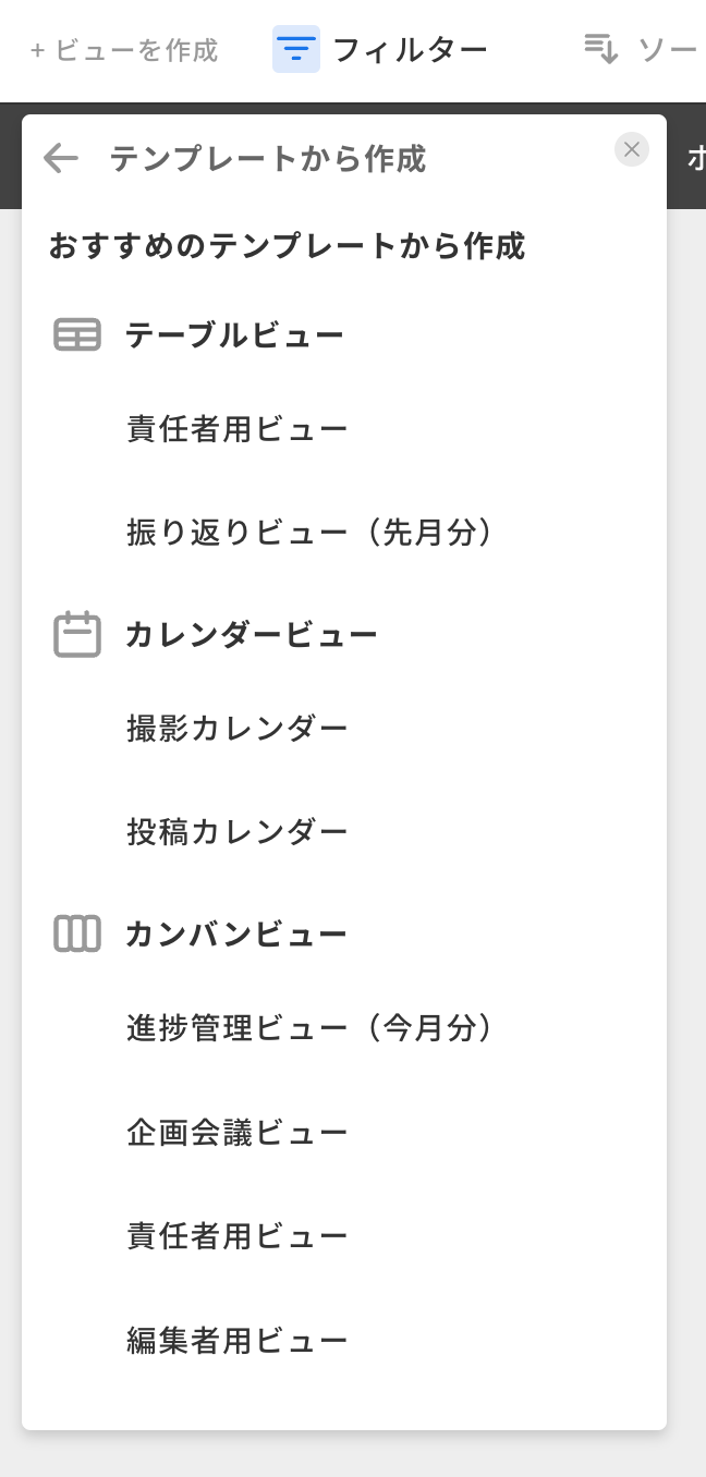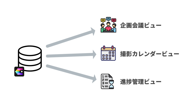 進行中の企画のスケジュールはカレンダーやテーブルでも確認することができます。撮影日、投稿日のスケジュールだけを一覧で確認するビューを作ったり、ディレクターが俯瞰して企画のステータスを把握できるビューを作ることもできます。
