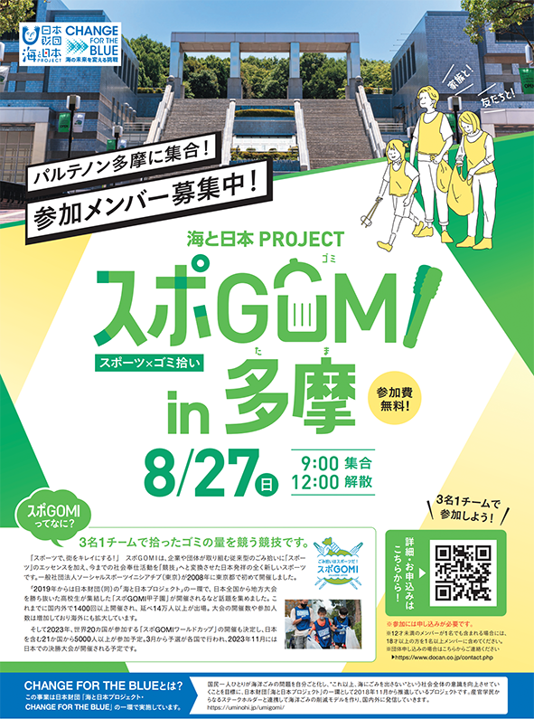 デザイン・オフィス・キャンは、「スポーツで、街をキレイにする!」というスポGOMIの趣旨に賛同し、「日本財団 海と日本プロジェクト・CHANGE FOR THE BLUE」の一環として、多摩市で開催されるスポGOMIの運営を行うことになりました。デザイン・オフィス・キャンでは、今後この「海と日本PROJECT スポGOMI in 多摩」を継続的に開催していくことを目指しています。