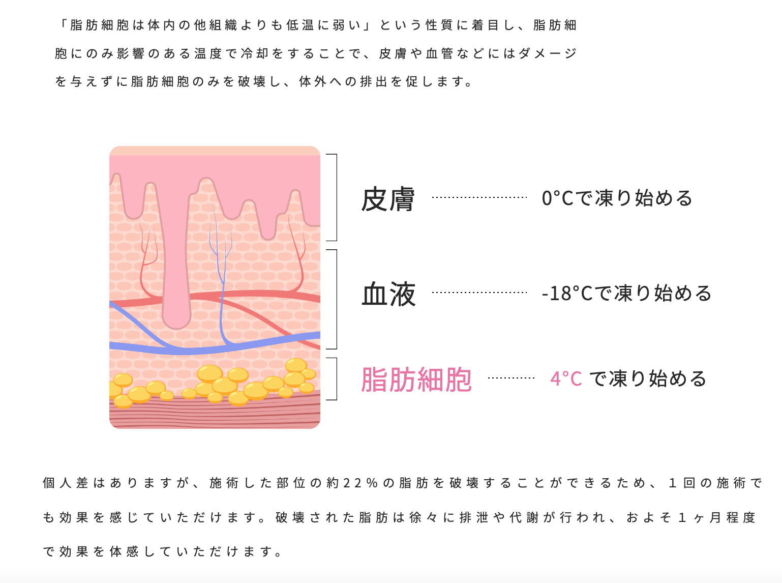 クライオポリシス(脂肪冷却)は“脂肪細胞”と“皮膚”との凍る温度差を利用した痩身医療です。皮膚は0度で凍りますが、脂肪は4度から凍るため、皮膚や血管などにダメージを与えることなく脂肪細胞を部分的に冷却することが出来ます。冷却し、破壊された脂肪細胞は、徐々に排泄や代謝が行われ、およそ1ヶ月程度で効果を体感していただけます。