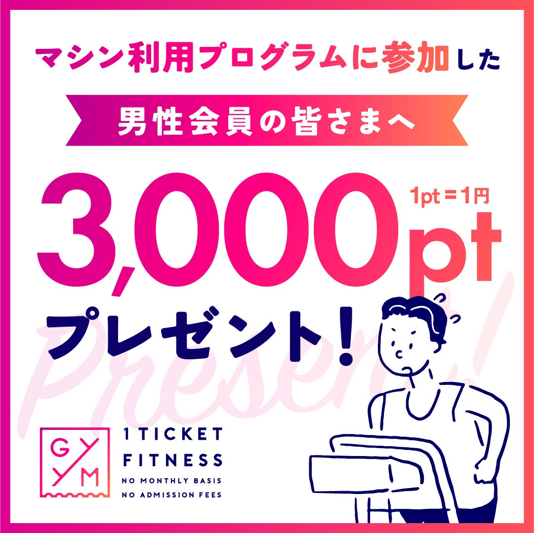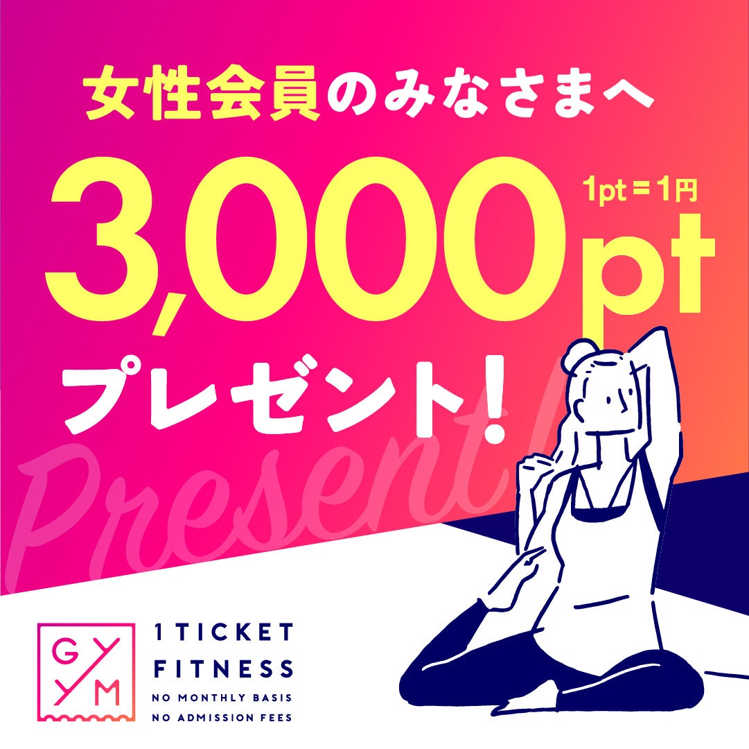 個別の入会金や月会費等の固定費用を支払うことなく、様々なフィットネス施設の予約・利用が可能な「1 TICKET FITNESS(ワン・チケット・フィットネス=都度利用制度)」を展開するGYYM(ジーム)株式会社(代表取締役:征矢貴彦)は、お客様への感謝の意を込め、加盟施設数1,000施設突破を記念した「3,000ポイント(=3,000円相当)プレゼントキャンペーン」を実施いたします。本キャンペーンを通じて、GYYMのサービス認知向上および利用促進を図るとともに、提携施設における多様なプログラムや設備をご体験いただく機会を提供いたします。この機会にぜひ、提携施設のマシンジム、サウナ、ホットヨガ、プールなどのプログラムをお楽しみください。