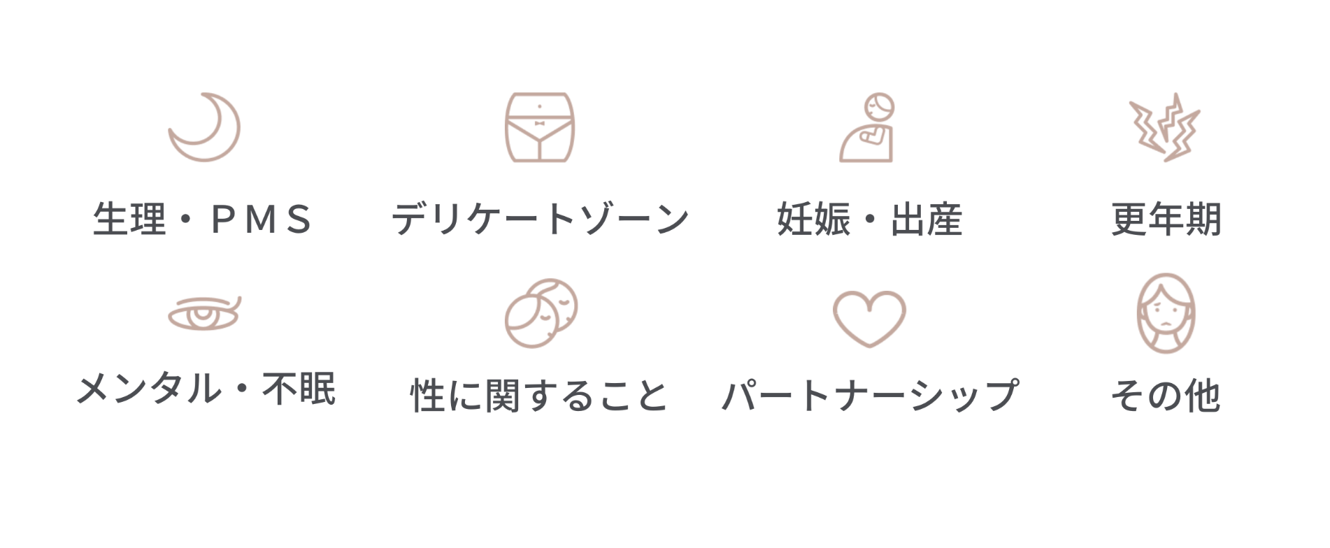 女性の生理、妊娠・出産、更年期など、ライフイベントに起因する十人十色のココロとカラダのお悩みに寄り添う場として、お悩みに関連する商品とアプリ・サービスをご紹介します。