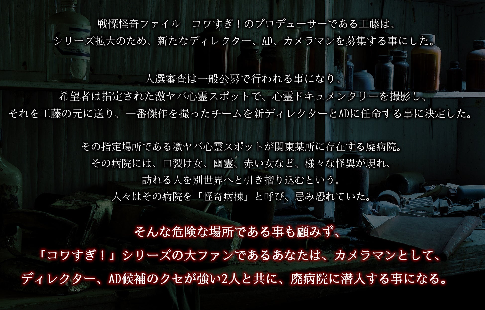 そんな危険な場所である事も顧みず、「コワすぎ!」シリーズの大ファンであるあなたは、カメラマンとして、ディレクター・AD候補のクセが強い2人と共に、廃病院に潜入する事になる。