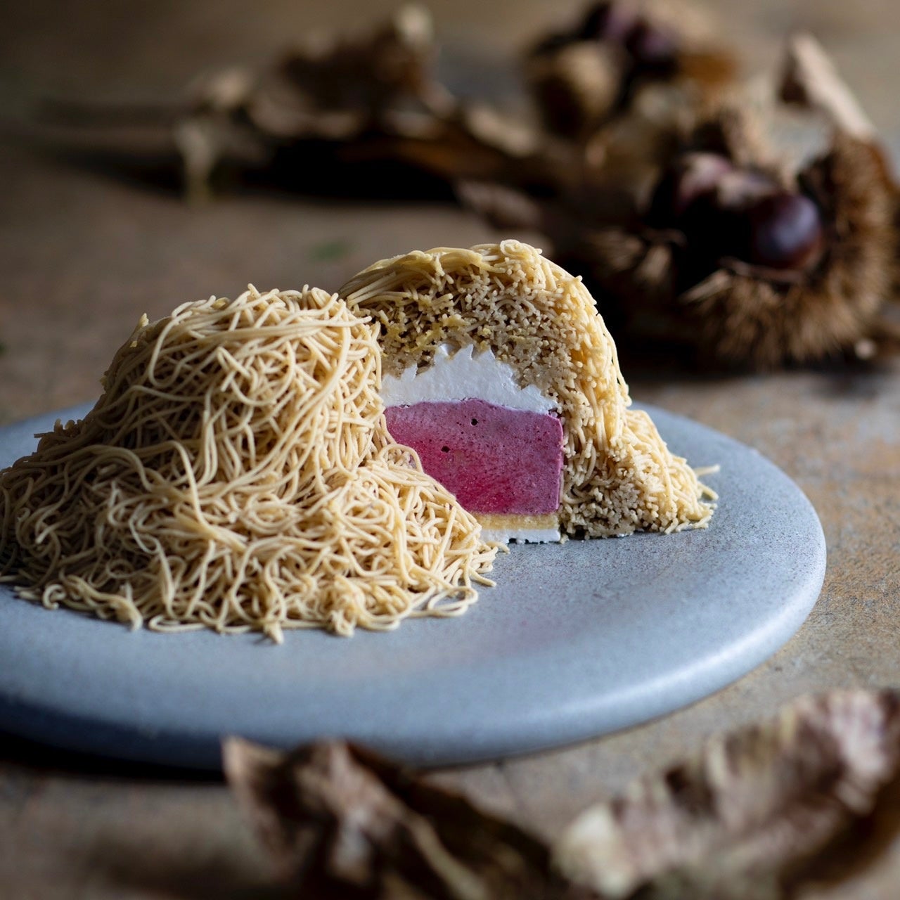 綾用に愛媛県産和栗と熊本県産和栗をブレンドしたモンブランクリームを使用しています。中身は焼メレンゲ・スポンジ・カシスムース・生クリームが入っています。カシスムースの酸味が、和栗の味わいをさらに引き立てる新しい和栗モンブランです。