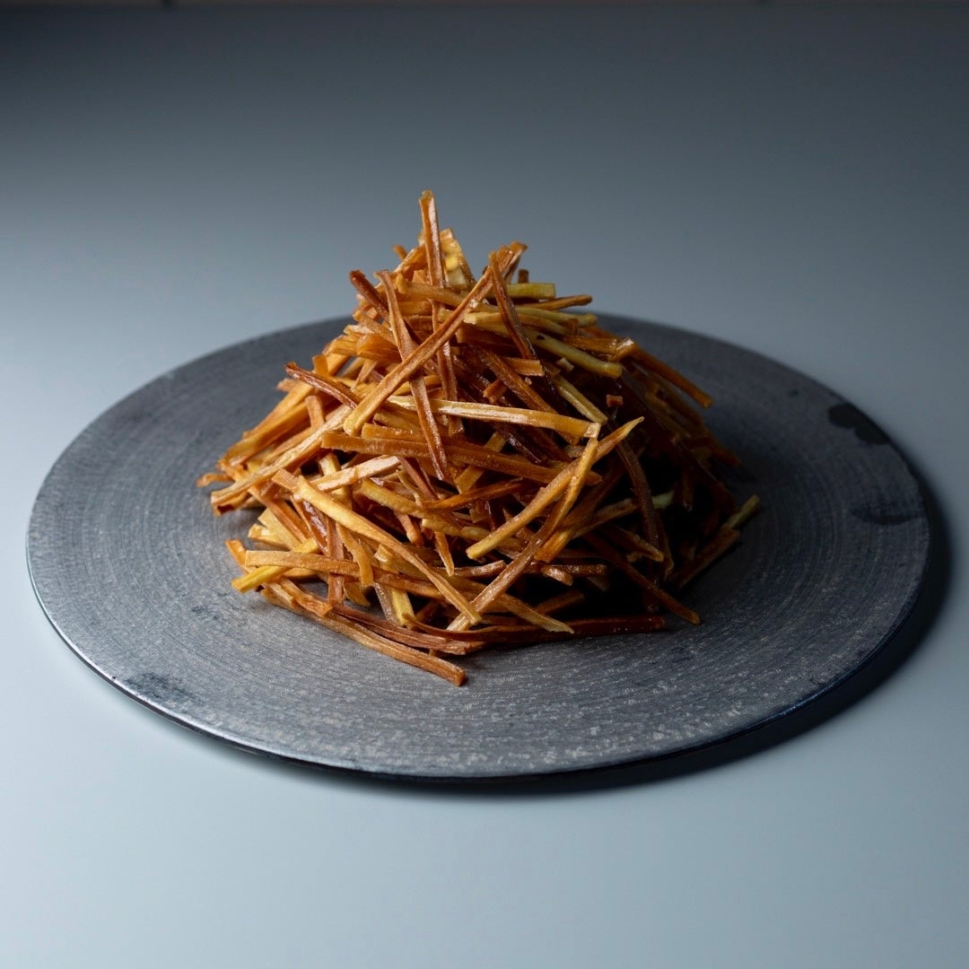 新鮮な紅はるかをスライスし、そのまま素揚げ。パリパリと口当たりの軽い食感に仕上げました。さつまいも甘さしっかり活かした当店の芋けんぴは、ついつい食べ過ぎてしまう魔性の一品です。