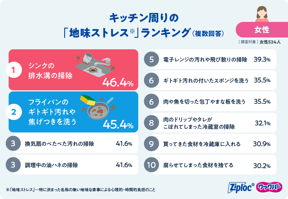 そんな家事負担や時間との戦いに悩める女性たちの間で、今どんな家事が負担になっているのか、キッチンで『地味ストレス』を感じる家事を集計。排水溝や油汚れの掃除といった掃除周りのストレスが上位にランクインすることが判明しました。