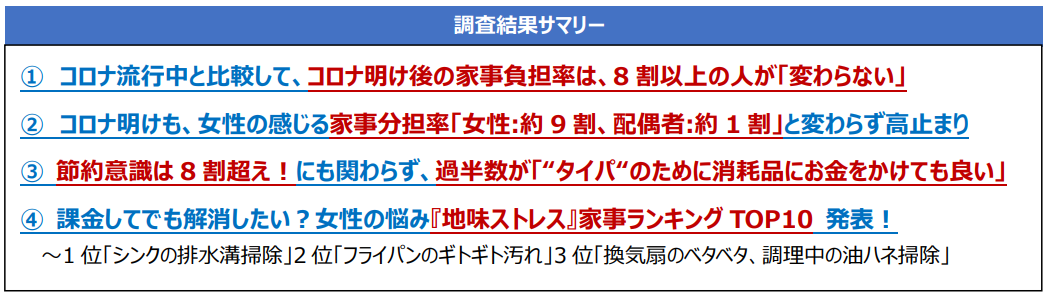 <コロナ明けの23年度・家事の実態調査を実施>節約時流にも関わらず、女性の半数以上が“タイパへの消費意欲”あり!課金してでも解消したい!?家事の 『地味ストレス』ランキング発表