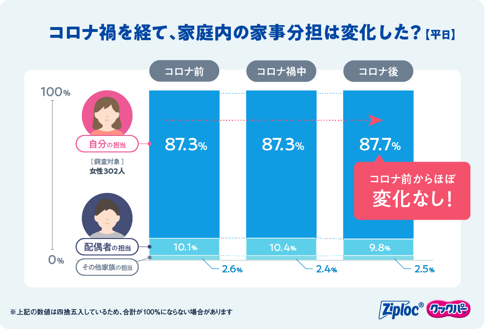 コロナ期間中に家事分担に関する多くの議論が起こったにも関わらず、コロナ前と変わらず高止まりのままということが分かります。