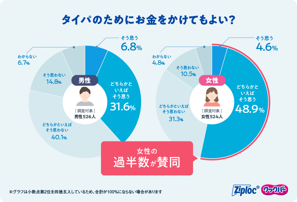 ここ最近の値上げ動向における節約意識についても調査しました。結果、全体では77.1%、うち女性は81.3%が節約を意識している傾向にありました。一方で、「家事負担の軽減やタイパをよくするために、消耗品など多少のお金をかけてもよいと思うか」という質問に対しては、こうした節約時流にも関わらず女性の過半数以上である53.5%が賛同するという結果に。出社再開と家事の両立において、さらに時間への意識が高まっていることが伺えます。