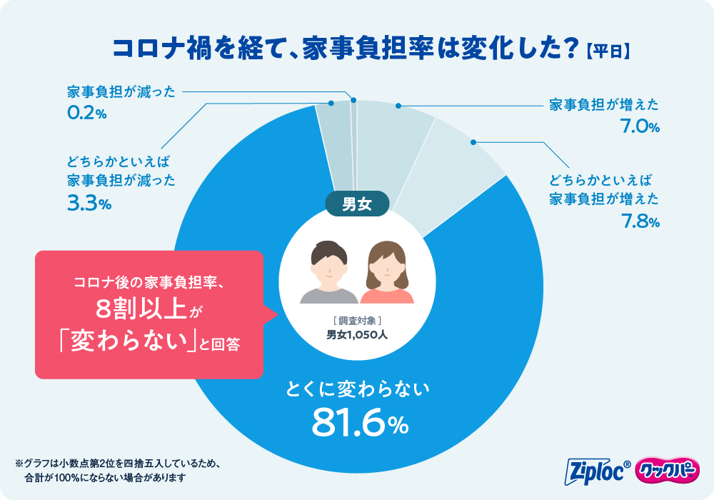 新型コロナウイルス流行中から流行後の家事負担率の変化について質問したところ、「増えた」と回答した人が14.8%、「減った」と回答した人が3.5%に対して、81.6%の男女が「変わらない」と回答しました。