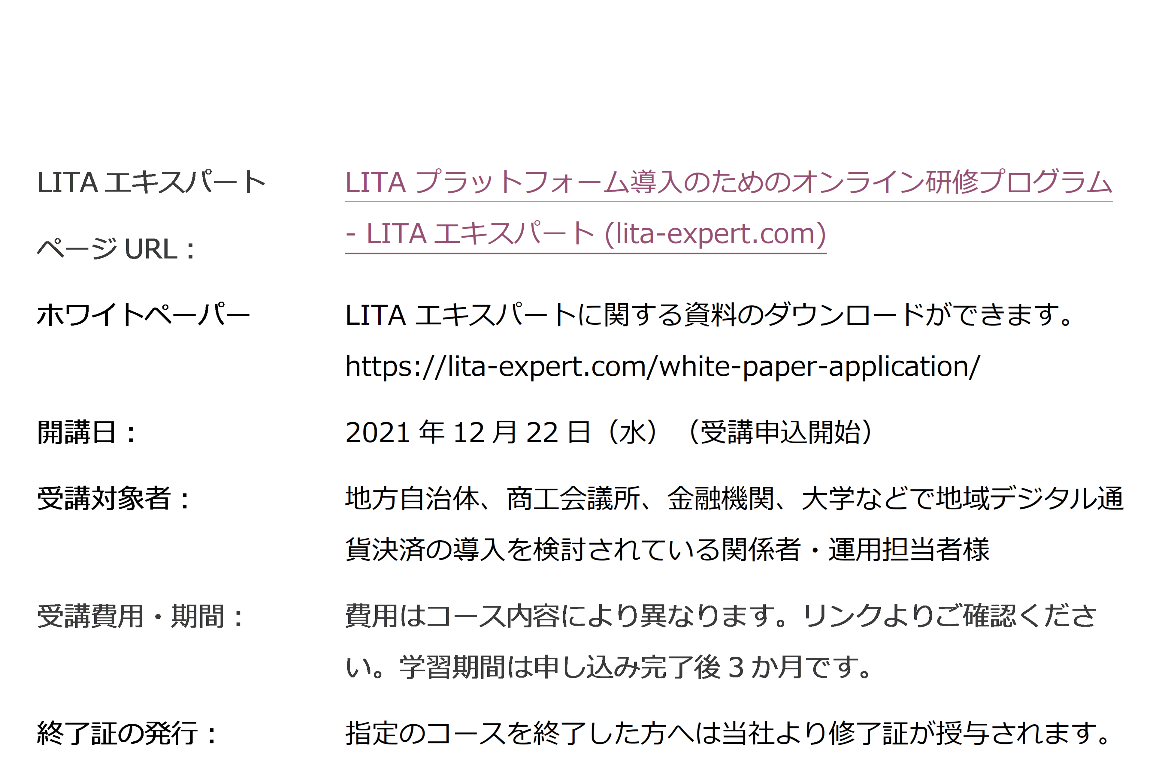 LITAエキスパートページURL ホワイトペーパー LITA エキスパートに関する資料のダウンロードができます。 開講日