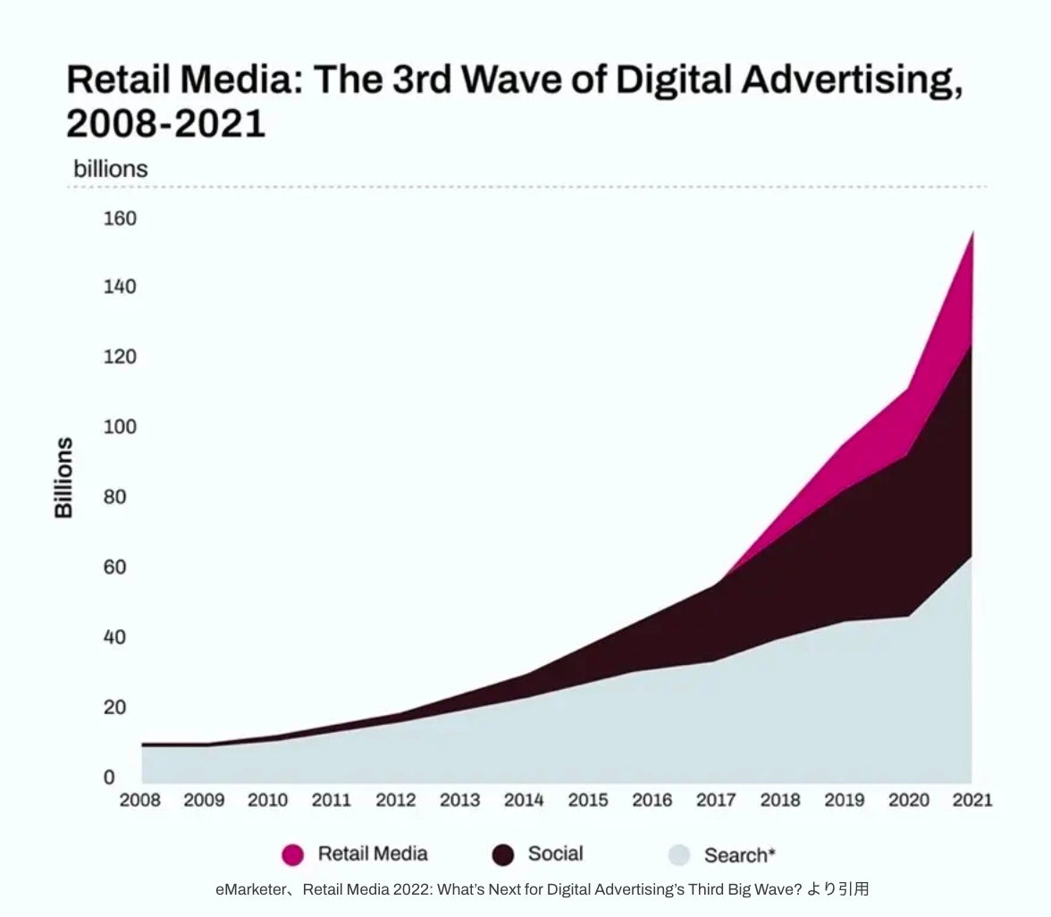サードパーティクッキー規制の流れを受け、デジタルマーケティングの世界では従来のようなCookieに依存したターゲティングやコンバージョントラッキングが難しくなり、各企業が新たなマーケティング手法を模索しています。その中で注目を集めているのがリテールメディアで、実際にその市場は急成長しています。