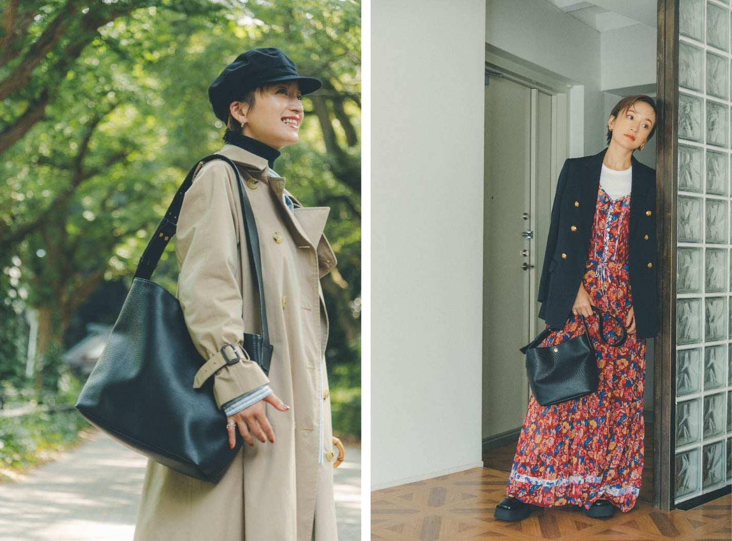 左:大好きなトレンチを黒小物で引き締めるのがMY定番。