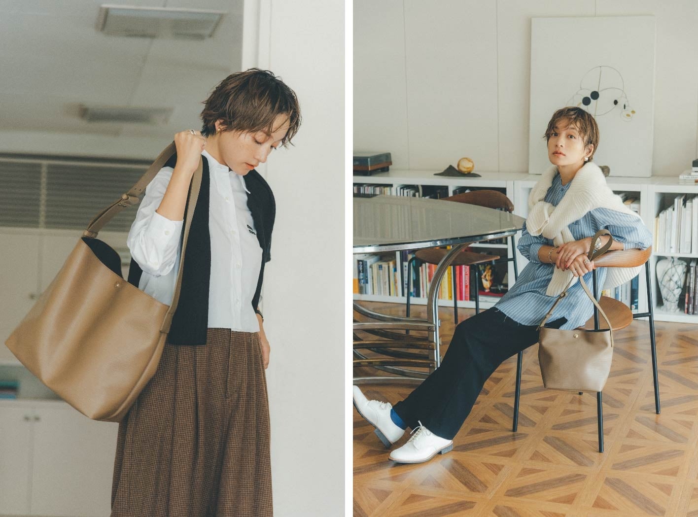 左:白、黒、ベージュの潔い配色もマニッシュなイメージへと後押ししてくれます。