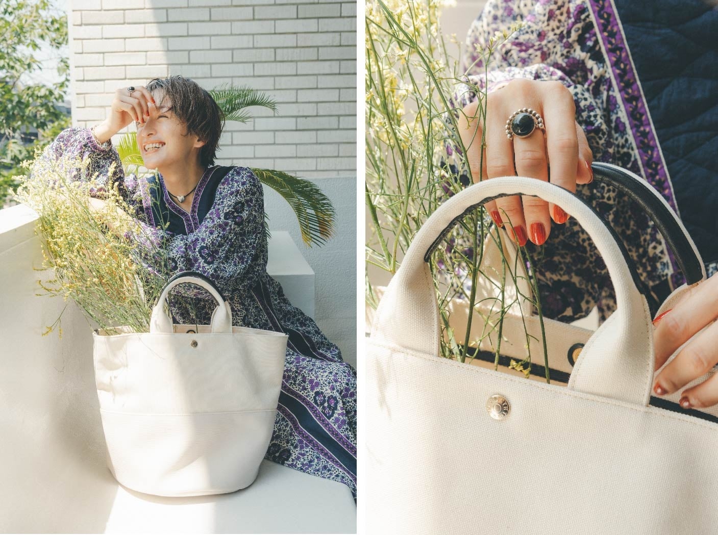 海外の女性がラフに物を詰め込む“マルシェバッグ”をイメージしたキャンバストート。フレッシュな白に、持ち手の黒配色で引き締めて。リングやチョーカーの黒リンクも密かなこだわり。
