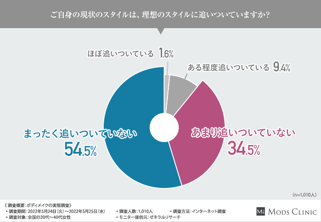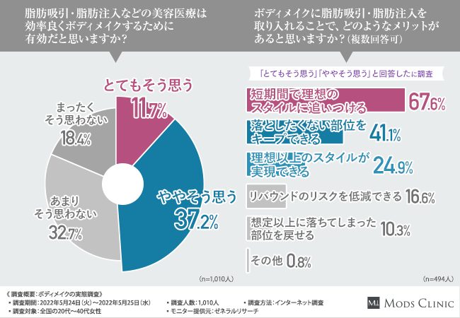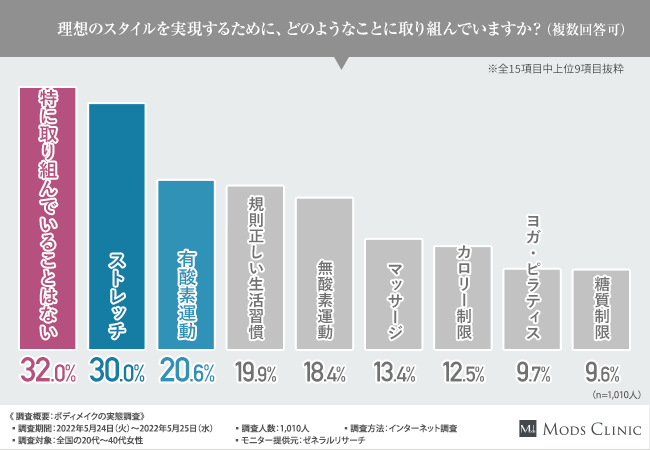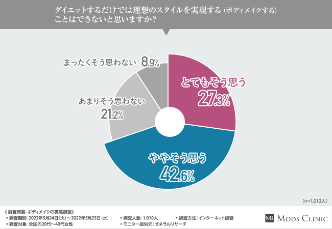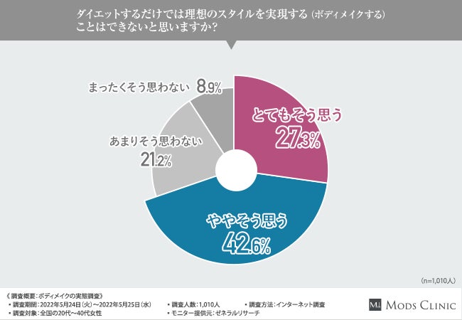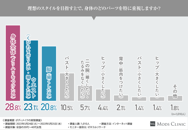 脂肪吸引・注入などのボディデザイン施術を専門とする美容外科『Mods Clinic(モッズクリニック)』(https://www.mods-clinic.com/)は、全国の20代~40代女性1,010人を対象に、「ボディメイクの実態調査」を実施。