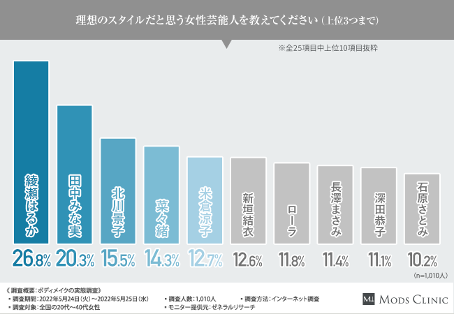 「理想のスタイルだと思う女性芸能人を教えてください(上位3つまで)」と質問したところ、『綾瀬はるか(26.8%)』が最も多くの票を集めました。