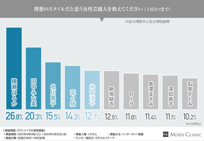 - 理想のスタイルだと思う女性芸能人第1位は『綾瀬はるか』。以降『田中みな実』『北川景子』と続く