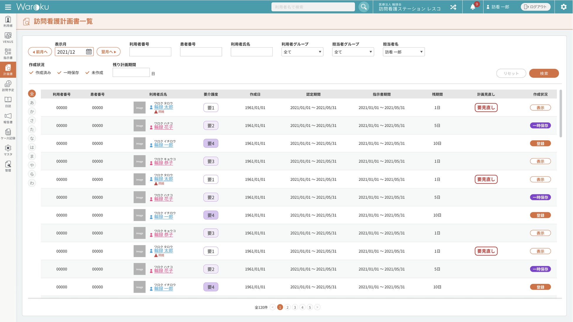 「Waroku訪問看護 ver.2」では、帳票類に情報を自動的に転記することで、入力の手間を軽減し、転記ミスを防止します。さらに、各書類の進捗状況や期限が、患者・利用者ごとに一覧で確認できる画面を実装。作成漏れや期限超えを未然に防ぎます。