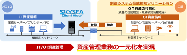 「制御システム脅威検知ソリューション」で工場内のネットワークに接続された資産を自動的に検出し、「SKYSEA Client View」へ登録することで、これまでIT/OT各々で実施していた資産管理業務を一元化します。